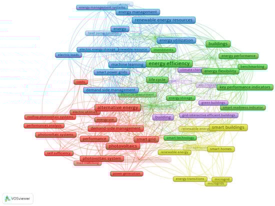 Moreover, several distinct clusters are discovered in the literature. A major cluster centered on energy performance and efficiency reaffirms the continuing interest in the evaluation and improvement of the performance and sustainability of building and grid systems. This cluster often overlaps with keywords related to benchmarking, green buildings, and life cycle assessment, revealing continuous concerns about environmental impacts. Another important visible cluster focuses on renewable energy integration, including terms such as renewable energy resources, energy utilization, energy storage, and power grids. This cluster, however, is in close relationship with the previous cluster and mainly focuses on decentralized energy generation and storage strategies, such as technologies for photovoltaics and battery systems.