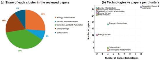 The scatter plot presented in Figure 3b reaffirms the findings, showing the cluster of generation, control, and automation as the most mature technological cluster, with the highest number of technologies and the highest number of studies adopting and evaluating this cluster of smart technologies, while the energy systems with the lowest variety of existing technologies and data analytics, the focus of the lowest number of studies, can be realized as the area for further research efforts in the future.