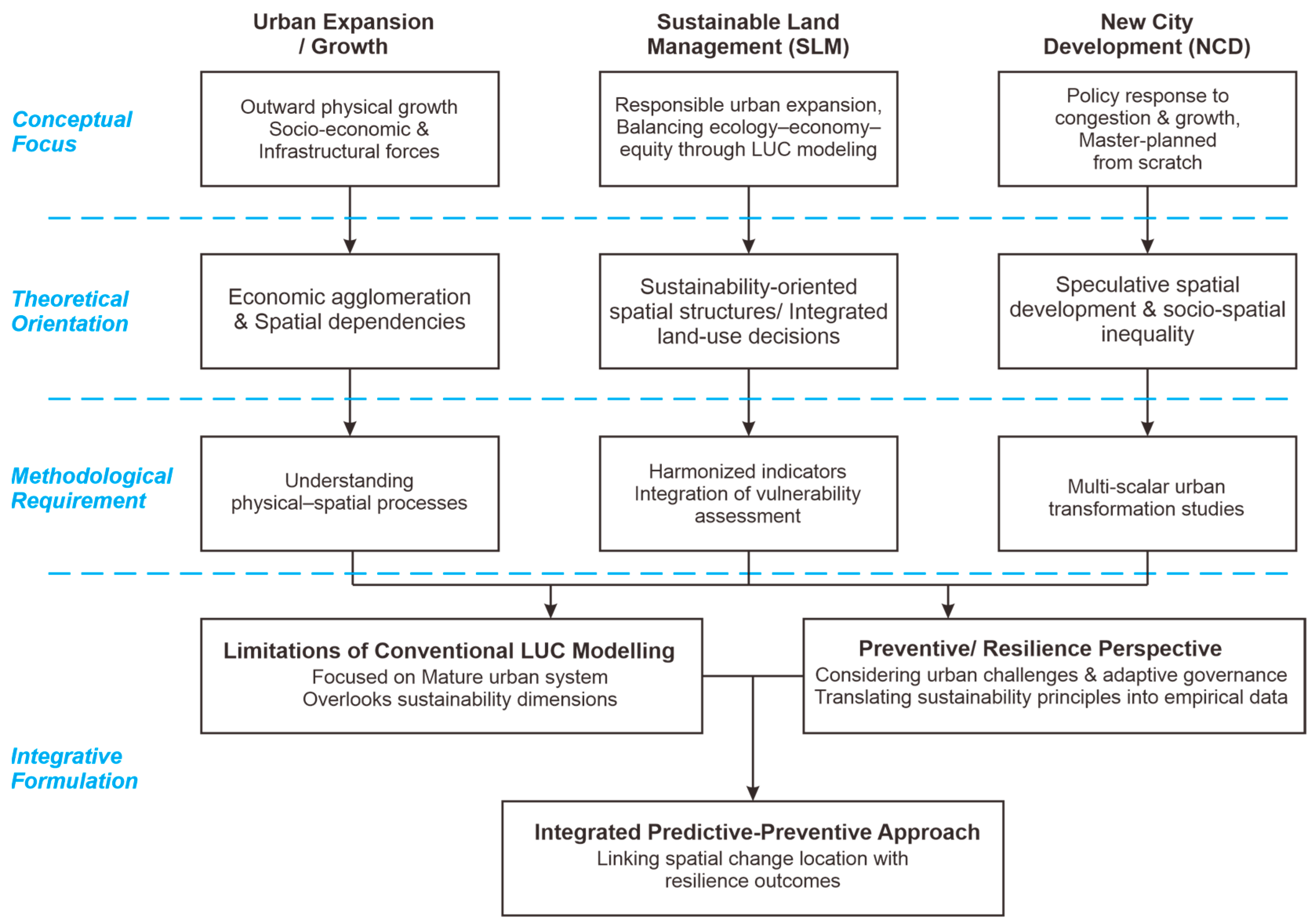 In this regard, the sustainable land management (SLM) perspective offers a crucial framework for directing responsible urban expansion. This approach emphasizes the importance of balancing ecological services, economic functions, and social equity, which are crucial for shaping spatial structures and influencing land use decisions in NCD [31]. Despite its potential application in urban land systems, recent reviews by [32] highlighted that SLM research still faces significant methodological and conceptual limitations, including a lack of harmonized indicators and limited adoption of vulnerability-oriented assessments.