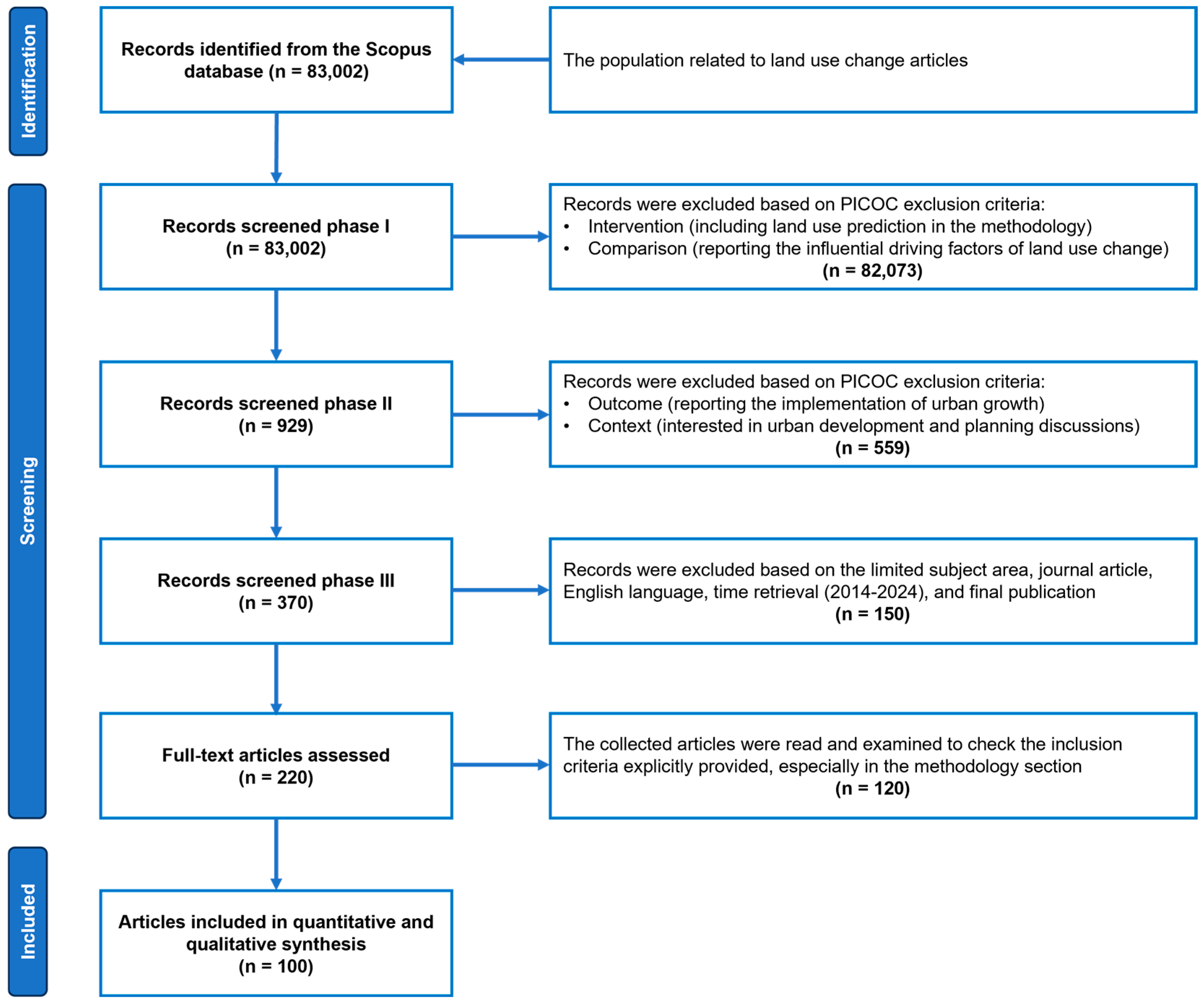 To support effective literature searches using specified keywords, the study implemented the Population, Intervention, Comparison, Outcome, and Context (PICOC) criteria to decompose the objectives of SLR into searchable keywords and develop relevant search terms [39]. PICOC guidelines identify and screen the articles to be included in the study, as defined in Table 1. The study also limited the literature selection to peer-reviewed English publications between January 2014 and October 2024, and only selected articles published in the field of Urban and Regional Development following the qualification of the Scopus repository, as this provides an extensive coverage resource, rigorous indexing, and analytical capabilities to conduct literature reviews on land use.