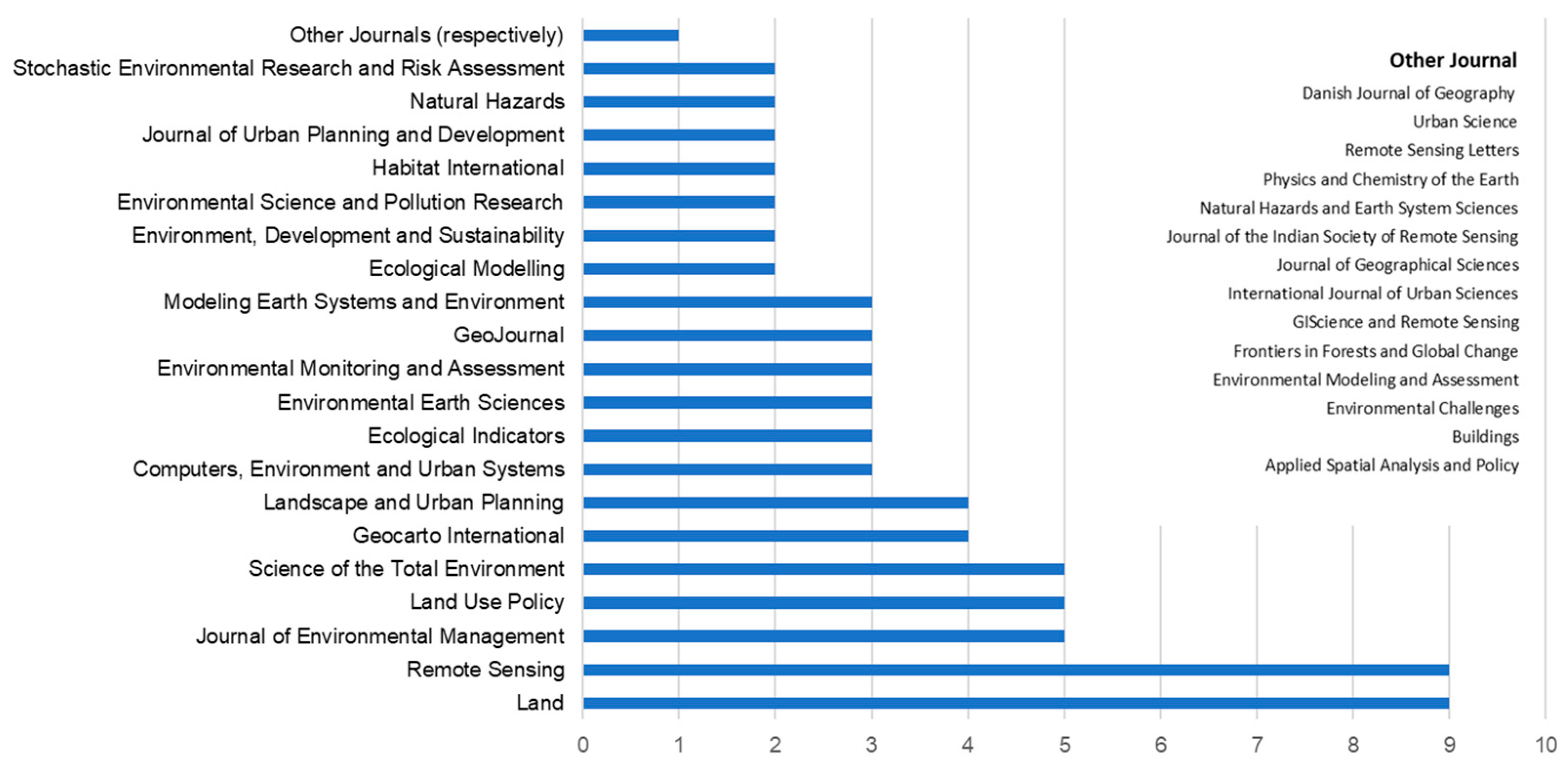 Figure 3 shows the contribution of journal publications as reference sources in SLR analysis. In general, 100 articles are distributed in 34 journals. The top 5 leading journals with over five records of scholarly articles published on the subject are Land (MDPI), Remote Sensing (MDPI), Journal of Environmental Management (Elsevier), Land Use Policy (Elsevier), and Science of the Total Environment (Elsevier).