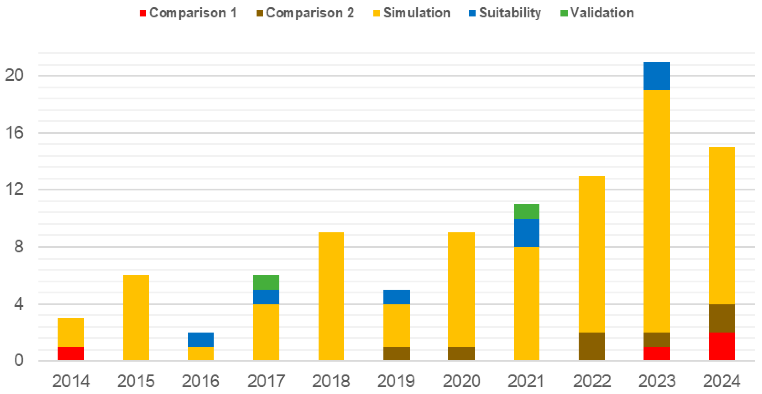 Finding the substantial development in LUC references and their classification based on model type is another source of analysis, as illustrated in Figure 5. The rise in quantity is accompanied by a discernible temporal distribution, categorized into five analytical models. The simulation-type articles are almost half, which analyze LUC patterns, project urban growth over time, and assess its implications under various policy scenarios. Since 2016, only 1–3 studies have focused on the Suitability model, assessing the potential of different land areas for various uses of urban development and non-urban land based on multiple drivers and constraints. There are 1–2 Validation model articles that evaluate the accuracy and reliability of growth rules in land use transformation, ensuring that the predictions produce accurate results closely aligned with real-world data. Moreover, Comparison Model 1 evaluates multiple simulation methods at each stage, whereas Comparison Model 2 assesses the accuracy of simulations generated by various factor weighting techniques.