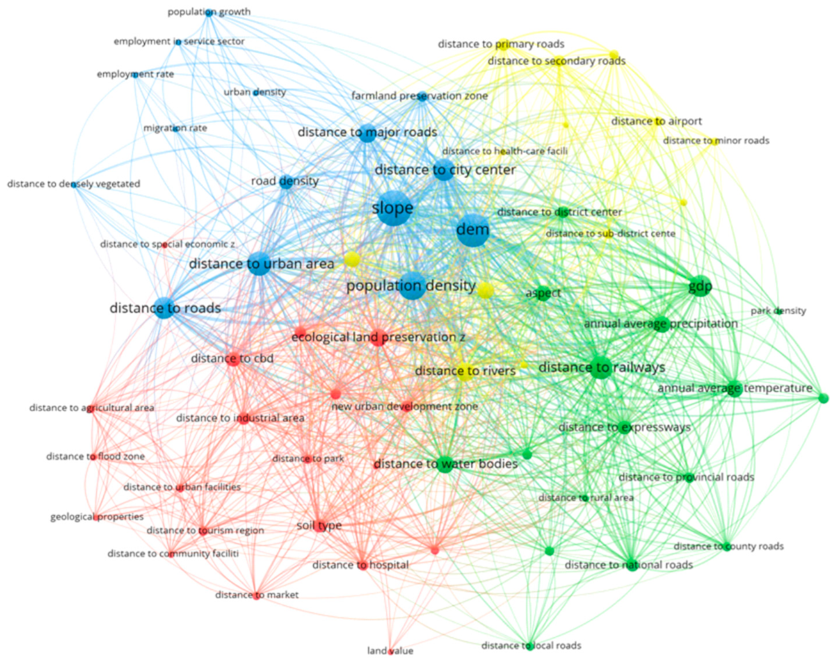 Slope and elevation are primary factors representing indicators in the physical geography category, frequently analyzed by researchers, and are essential in assessing land changes. These two factors are typically considered natural constraints on the expansion of constructed land [45,46]. This indicator exhibits the highest link strength, indicating a robust relationship, and is frequently integrated with other factors in LUC studies. Socio-economic indicators, such as population density and GDP, often reflect social distribution and economic activity, significantly affecting land demand [47]. Variability in factors is evident in the urban attraction indicator, particularly concerning proximity to activity centers and road networks. Activity centers are typically linked to urban areas, urban centers, and central business districts. Alongside general roads, numerous researchers have examined the classifications and types of road networks to elucidate their impact on land use dynamics. Environmental indicators, including precipitation and temperature, exhibit strong correlations with the growth of green areas [48].