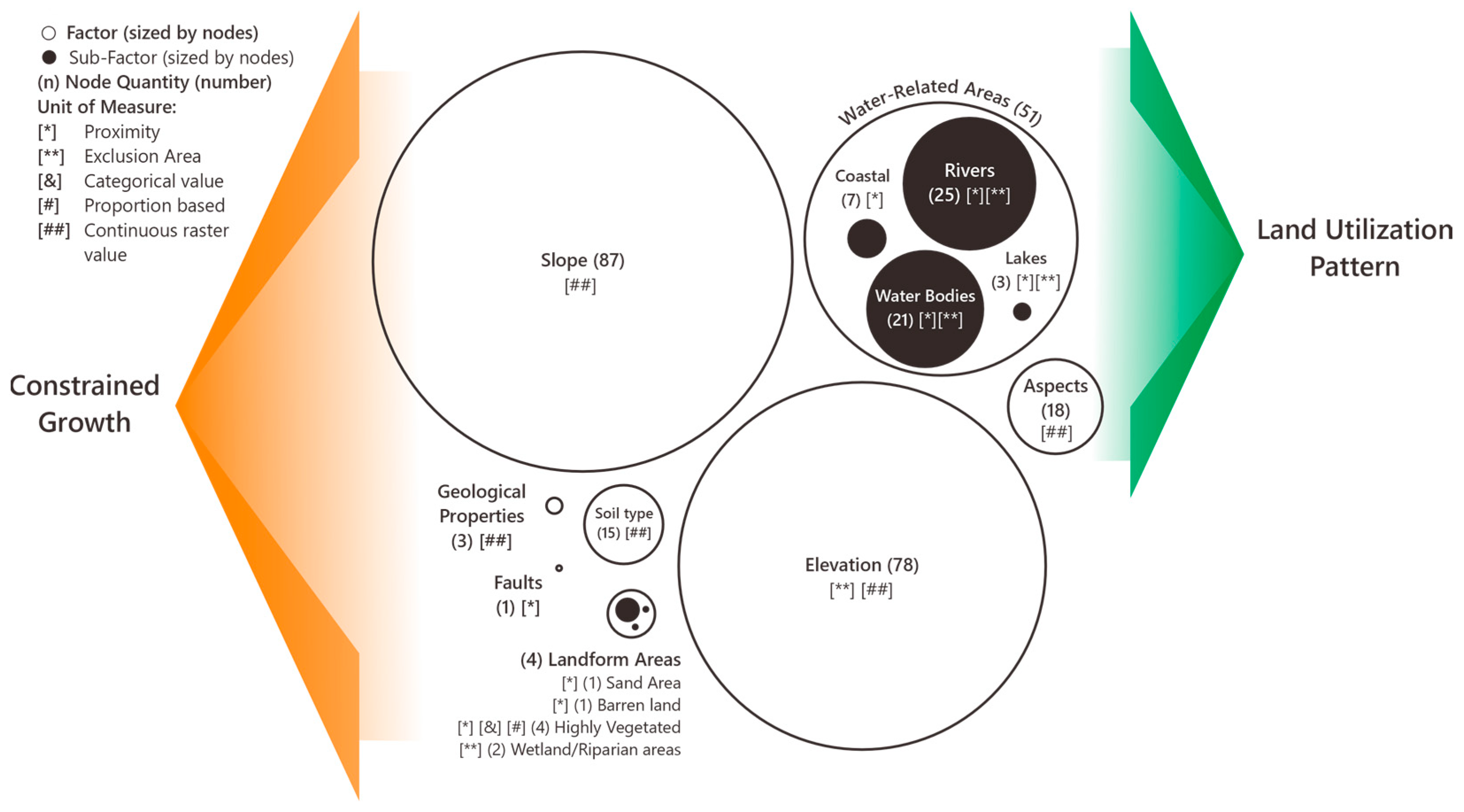 Physical geography encompasses natural elements, including landforms, vegetation, and geomorphic processes, which are essential for understanding LUC. The findings present eight factors in this category, as shown in Figure 7 and described in Table S3. Slope and elevation are the most frequently considered factors in this group. Almost all factors identified in the literature act as constraints on urban expansion, including slope, geological properties, soil type, distance to faults, and distance to ecological landform areas, as indicated by the orange arrows in Figure 7. These constraints help delineate ecological strengths and vulnerabilities to mitigate the adverse impacts of LUC [49], supporting responsible and sustainable land management.