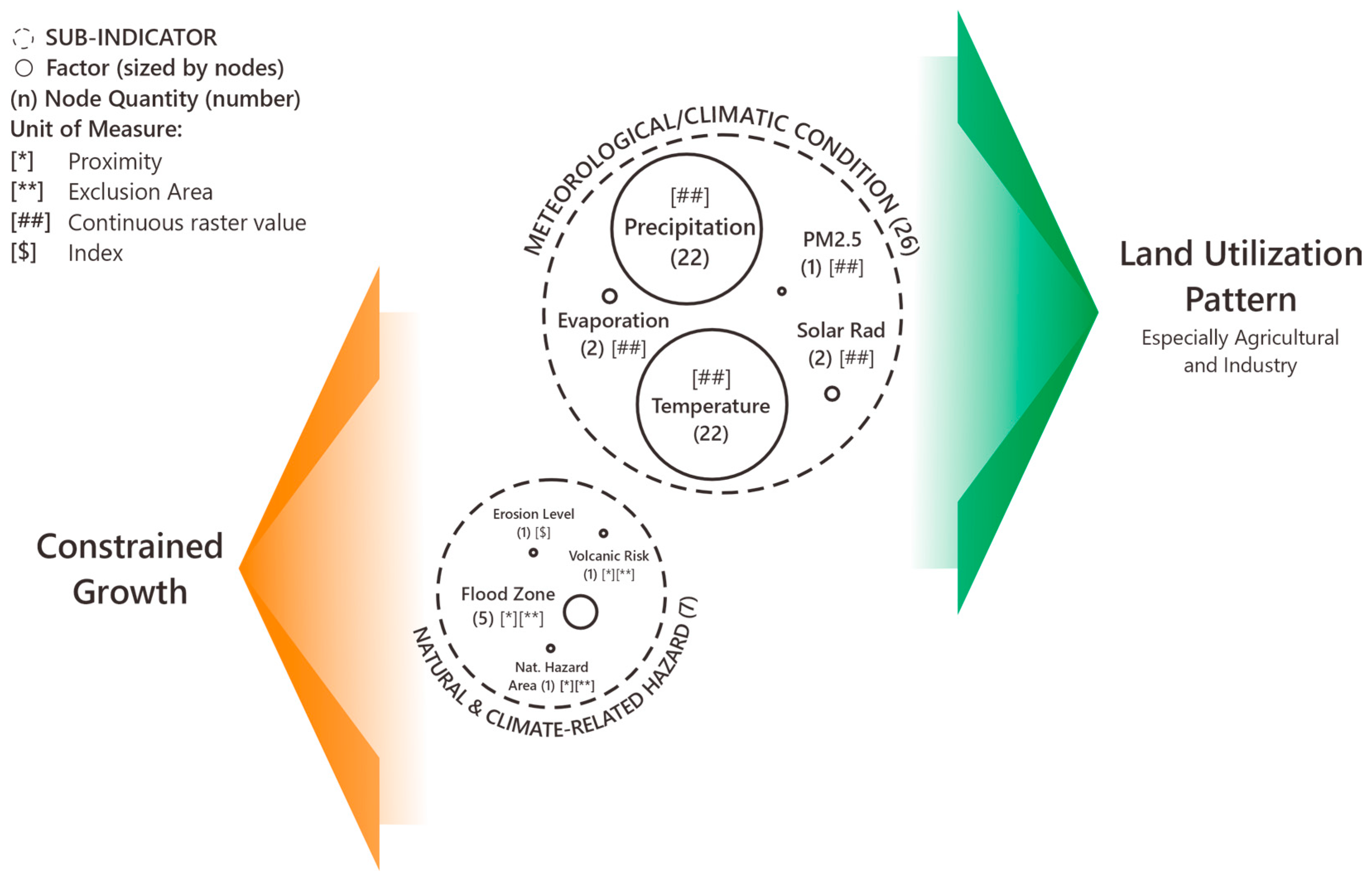In summary, climate-related variables remain undervalued in many LUC studies, as indicated by insignificant nodes in each group. However, inclusion of this indicator category in LUC models is essential for aligning urban expansion with existing environmental thresholds and climate change risks [11]. The conceptualization in Figure 8 illustrates that two groups play different roles. The meteorological conditions, including precipitation, temperature, evaporation, solar radiation, and air quality, shape the land use pattern and suitability for agriculture and urban areas. Four indicators in natural and climate-related hazards delineate environmentally sensitive regions. Incorporating these indicators into responsible land management enhances spatial decision-making, builds resilience to climate impacts, and fosters adaptive and ecologically sustainable urban developments.