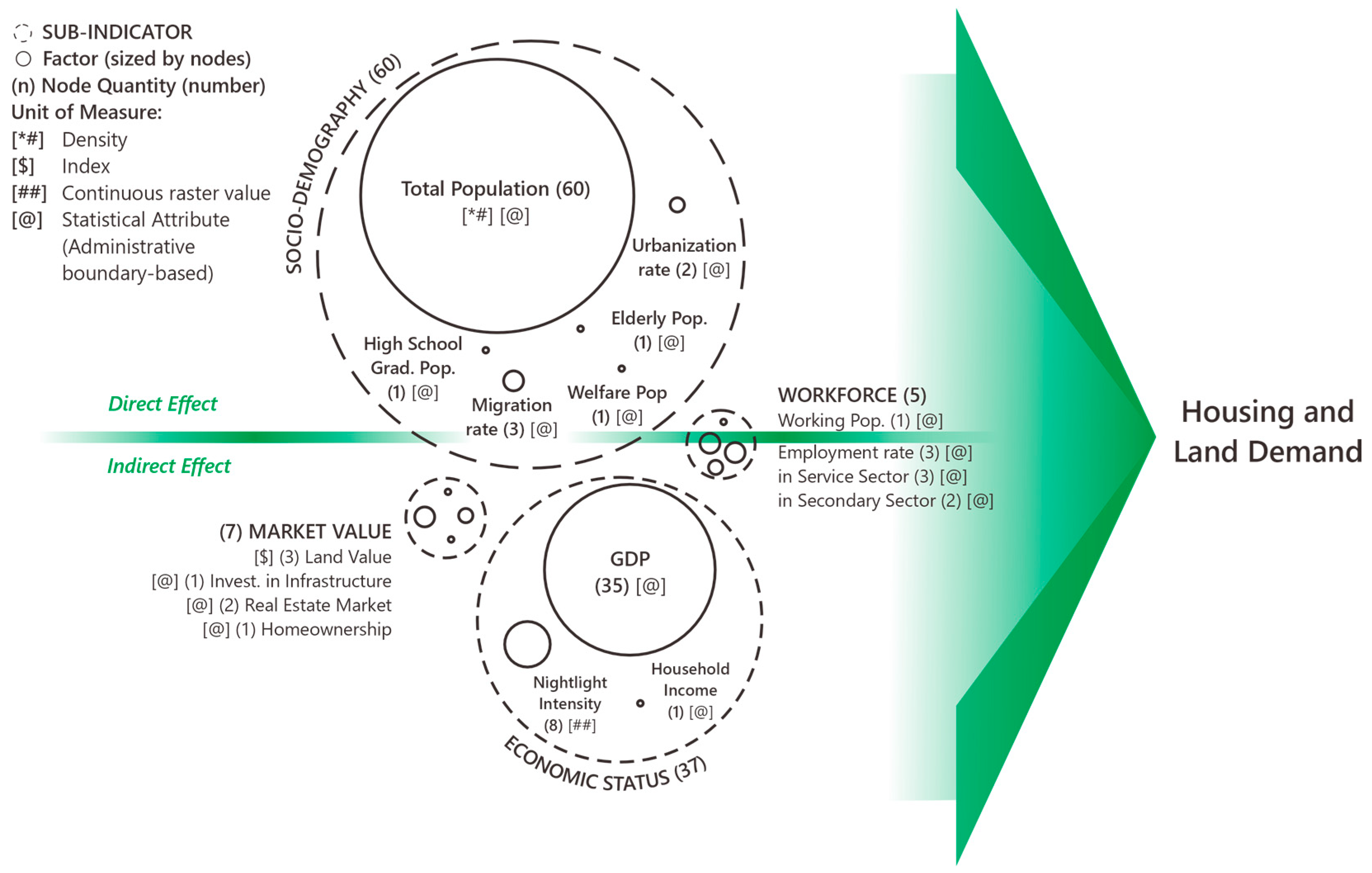 Based on the findings, indicators in the socioeconomic category create a feedback loop where socio-demographic, workforce, economic status, and market value mutually reinforce each other, accelerating economic development and population dynamics, as conceptualized in Figure 9 and listed in Table S5. The socio-demographics (6 indicators) capture residential pressure and spatial dispersion. On the other hand, while seven indicators of economic status and workforce reliably exert indirect effects on shaping urban expansion based on regional productivity, four indicators of market value illustrate a development pattern derived from economic market orientation. Understanding the land dynamics of interrelated socio-economic indicators is essential to assess future LUC, reflecting the socio-economic demand that influences spatial transformation. Their integration into sustainable land management strategies enables the ability to forecast development trends and formulate policies that promote economic growth and social equity.