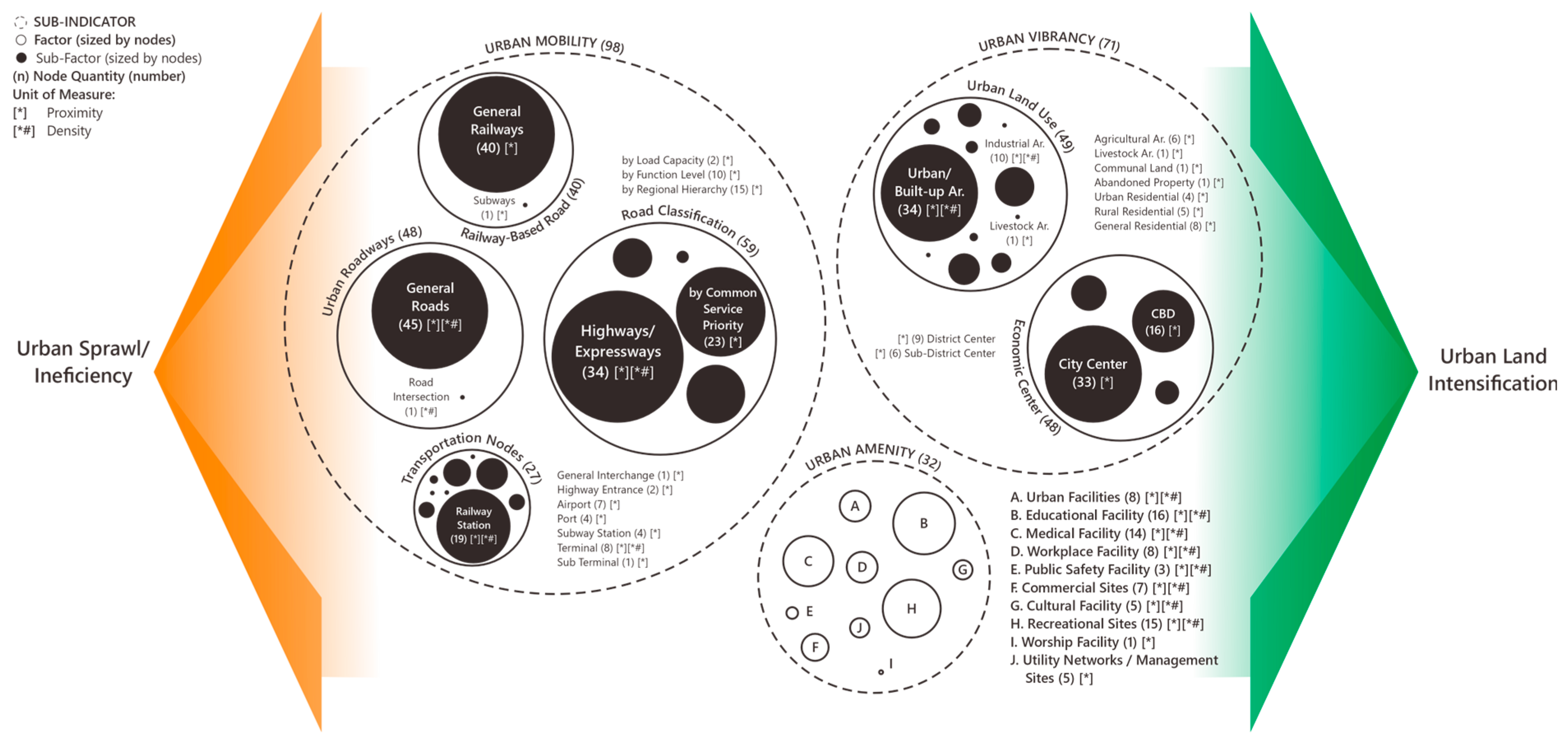 The urban attraction, as presented in Figure 10 and detailed in Table S6, consists of 16 indicators that transform urban spatial structure. This category can be distributed into three main groups: urban vibrancy (2 indicators), amenity (10 indicators), and mobility (4 indicators). The findings indicate that urban attraction can increase land intensity within the urban boundary, as illustrated by the green arrows in Figure 10. Conversely, the orange arrows illustrate that several factors can identify outward infrastructure development and new urban formations.
