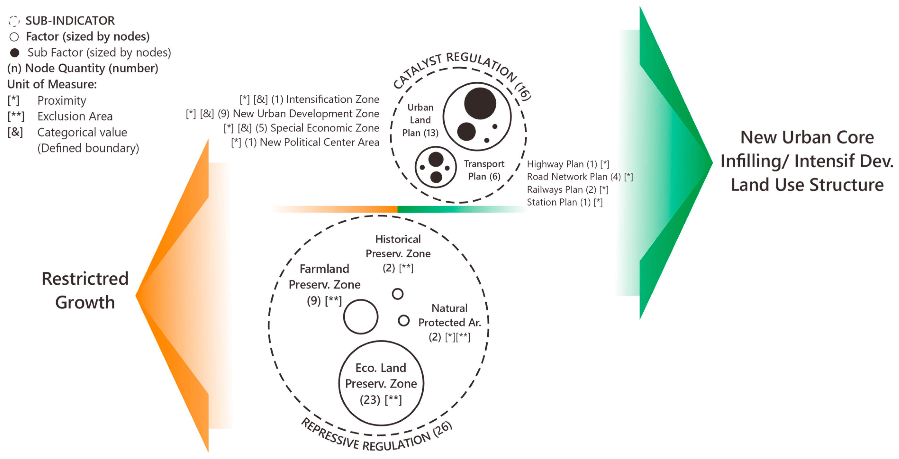 Figure 11 synthesizes findings of the aforementioned dual role of the policy and regulation category in LUC. Based on the node size, repressive regulation, which encompasses four indicators, was frequently employed as an exclusionary measure to limit urban expansion and preserve ecological, agricultural, and cultural assets, as indicated by the orange arrow. Conversely, urban development zones and infrastructure and transportation development plans act as catalytic measures, intensifying urban development, extending urbanized boundaries, and reinforcing urban functions (green arrow). This conceptualization underscores that the indicators, further described in Table S7, do not merely react to urban growth but actively shape the spatial management system. Understanding the interaction between these forces is crucial for predicting land use trajectories and developing sustainable land management strategies.