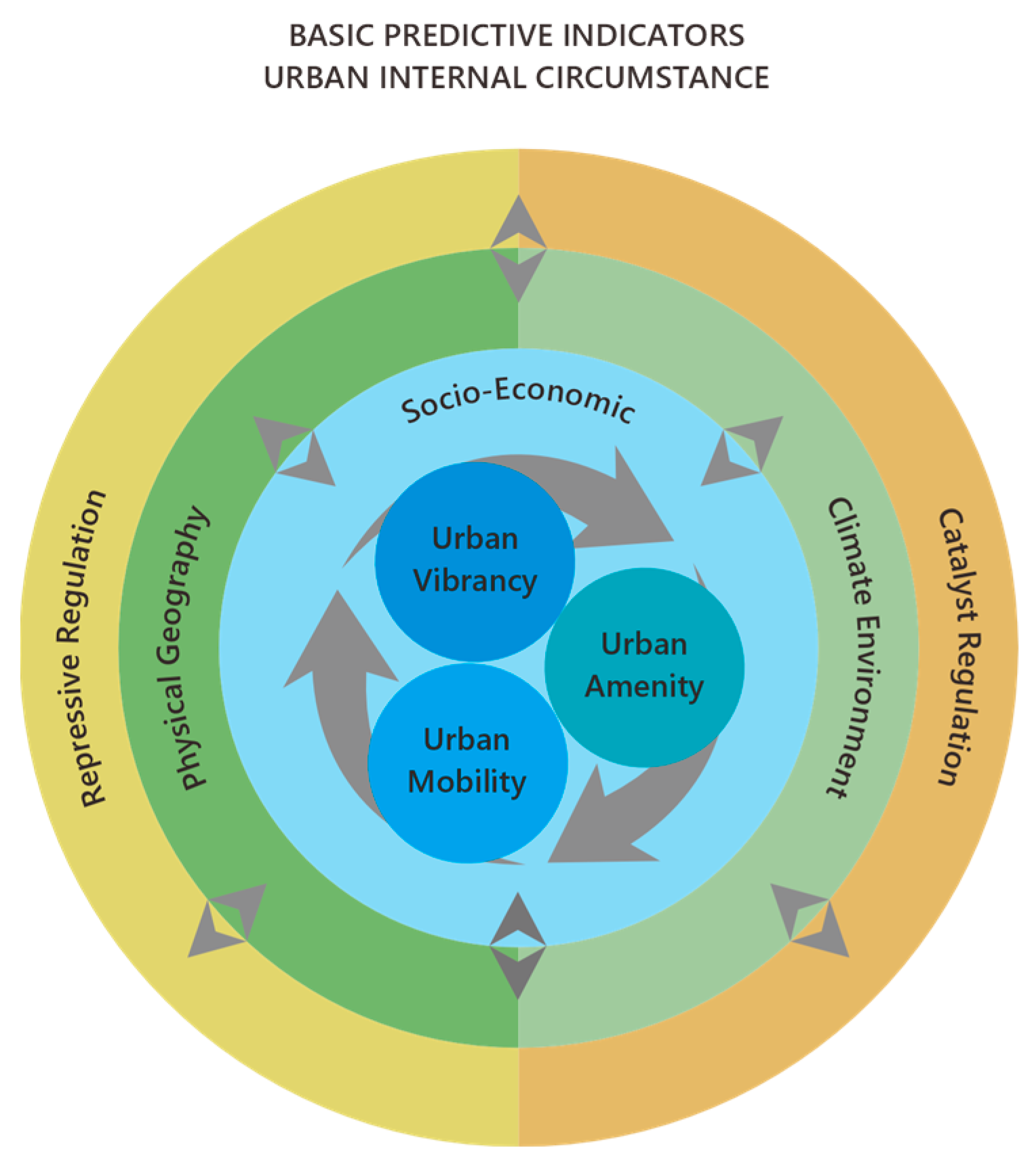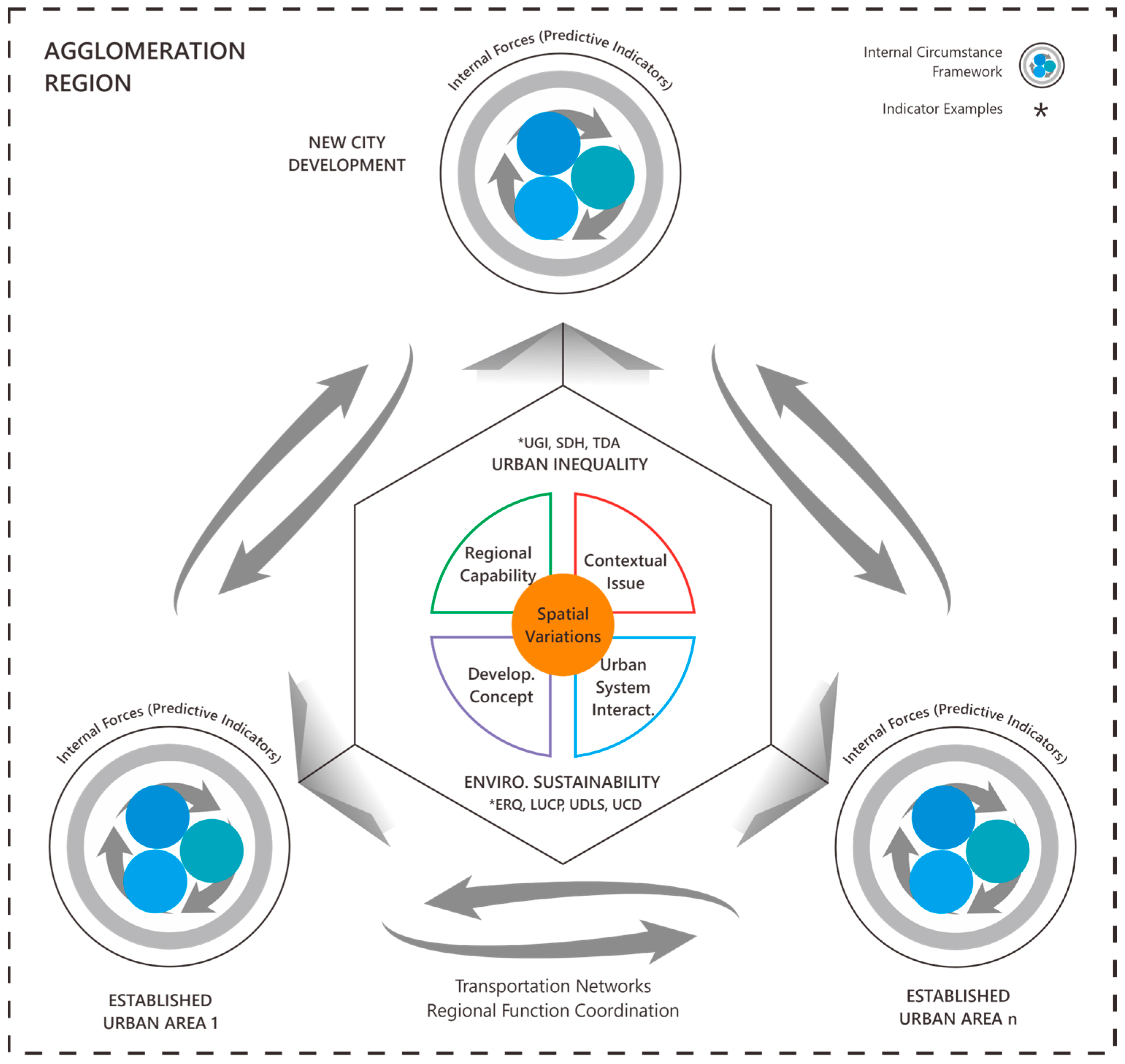 Despite new attractions from NCDs’ infrastructure enhancements, established cities also have inherent attractions. Both conditions delineate internal urbanization within each city, as depicted in Figure 13. The arrows in Figure 13 reflect conceptual directional interactions among indicator groups, emphasizing how each component influences and reinforces the others within the internal predictive structure. Urban mobility, vibrancy, and amenity reinforce urban attraction with adequate urban infrastructure and transportation, and tend to generate significant economic growth and a dense population. Therefore, indicators associated with urban attractions and socio-economic circumstances stemming from the internal structure of each established city are primary determinants of urbanization. However, urban growth should adapt to ecological characteristics and constraints. Thus, indicators in the physical geography category provide a foundation for understanding basic environmental conditions constraining urban growth, while climate–environment indicators can identify land suitability for specific land use (e.g., agriculture, industry, and urban settlement) to align with associated climate-related risks. Policies and regulations maintain the balance between urban development and environmental sustainability by incentivizing specific actions while restricting others. The indicators within the catalyst regulation group are likely to promote new growth and equitable urban development, while repressive regulation tends to constrain and direct growth to safeguard essential assets for urban sustainability.