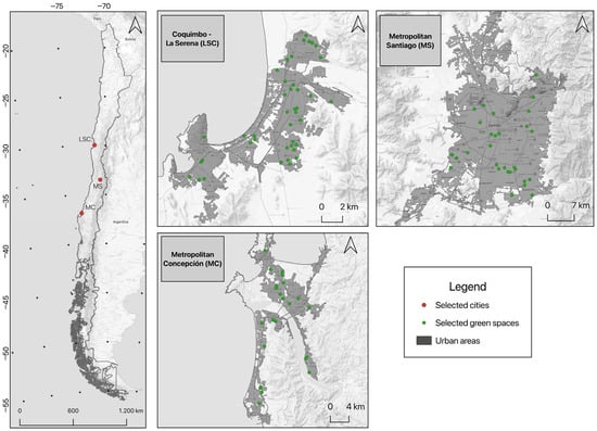 Three cities were analyzed, based on their representation of a latitudinal gradient across Chile, encompassing cities that are representative of different climatic conditions, covering Mediterranean conditions ranging from semi-arid to temperate transitions. They are cities that constitute metropolitan areas, each comprising two or more municipalities with populations exceeding 250,000 inhabitants and sharing common urban services. The three cities are La Serena–Coquimbo (29.90° S; hereafter LSC), Metropolitan Santiago (33.43° S; hereafter MS), and Metropolitan Concepción (36.82° S; hereafter MC), with coordinates referring to latitude (Figure 2). The latter two cities encompass 37 and 11 communes, respectively, while LSC is a conurbation of two communes. Together, these cities have a combined population of over 7.5 million inhabitants, accounting for 43% of the national population. MS is the most populous, with over 6 million inhabitants, followed by MC with nearly 1 million inhabitants and LSC with over 400,000 inhabitants []. The climate in LSC is characterized as cold semi-arid, with a dry summer and oceanic influence, while MS and MC have a Mediterranean climate with hot, dry summers, and MC also experiences coastal influence [].