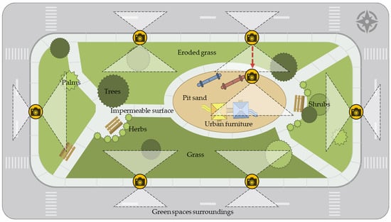 The image capture took place on hot summer days between 11 am and 4 pm. The procedure involved walking along the perimeter of the green space and capturing images of both the inside and the surroundings of GS at each cardinal point (Figure 4). To prevent the capture of sky portions that could affect temperature readings, the camera was slightly tilted toward the ground. For interior images, the distance was determined using an identifying object to ensure precise measurements and facilitate image processing. If the initial captures from each cardinal point did not cover all internal components of the GS, a second round of captures was conducted at a closer distance to the center. Similarly, if the initial captures did not adequately represent the urban surroundings of the green space due to its size or shape, additional captures were taken, as necessary.