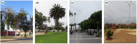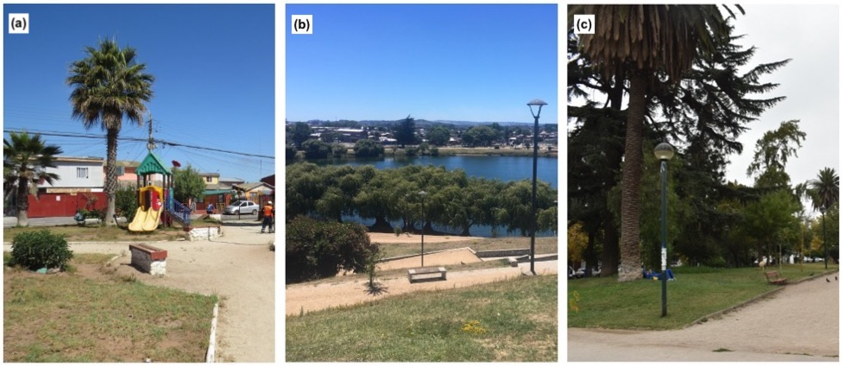 Examples of green space typologies: (a) represents a green space with low vegetation cover located in La Serena-Coquimbo; (b) shows a green space of Metropolitan Concepcion with medium vegetation cover, and (c) represents a green space in Metropolitan Santiago with high vegetation (tree) cover.