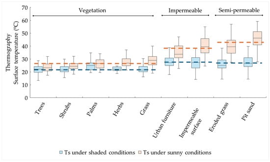 Based on the results comparing exposure conditions to solar radiation, it is evident that shade significantly affects the surface temperatures of the components. As expected, all components show lower temperatures when shaded. It is noteworthy that impermeable and semi-permeable surfaces, which exhibit the highest surface temperatures, also present the largest thermal differentials between shaded and unshaded conditions, with average temperatures reduced by 12 °C to 17 °C under shading. This emphasizes the importance of analyzing the configuration and design of these spaces to optimize the shading effect provided by vegetation, thereby maximizing temperature regulation [,,].