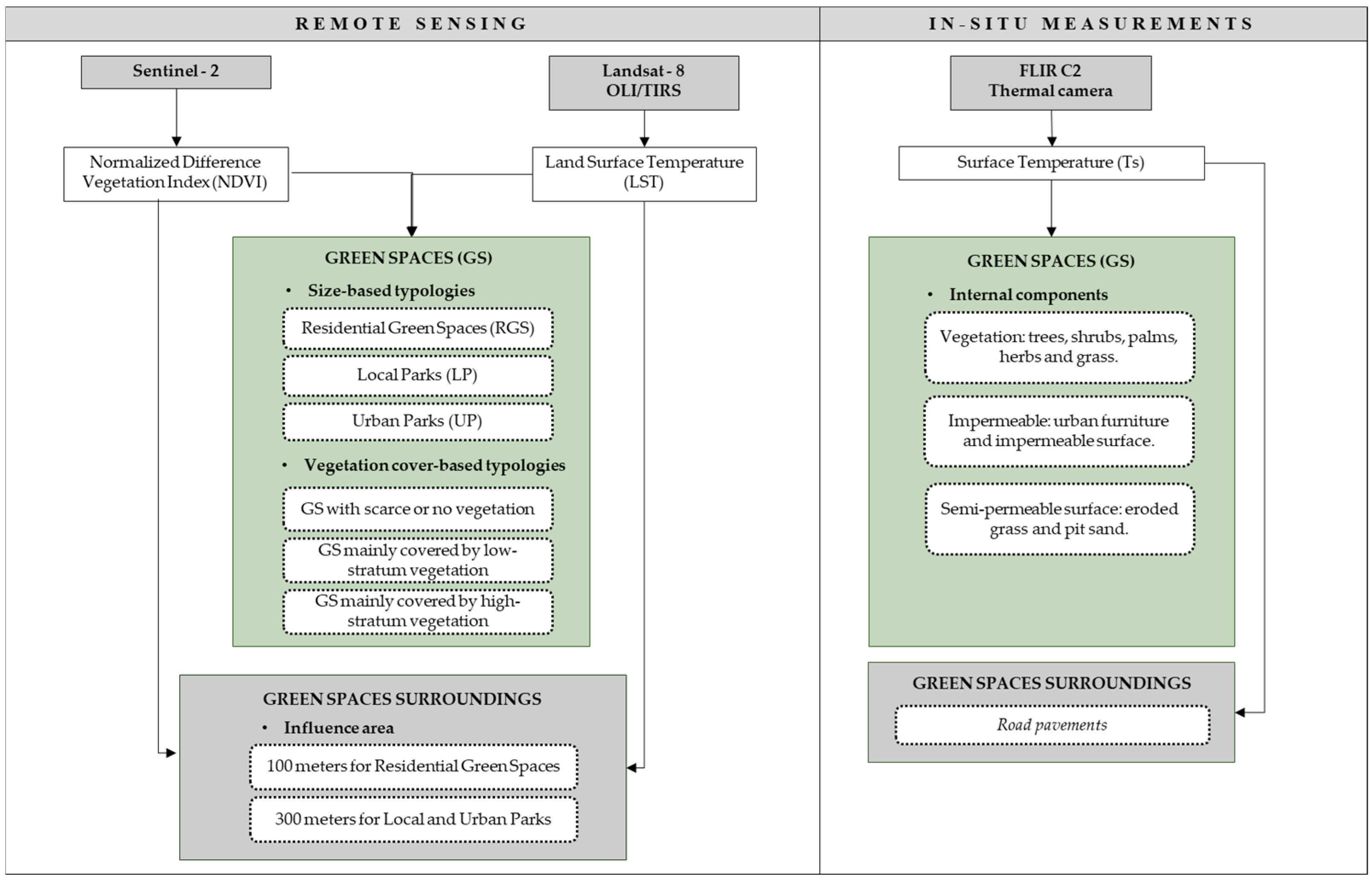 This study assesses the cooling effect of vegetation in 94 green spaces (GS) of diverse typologies based on their quantity of vegetation and their surroundings by analyzing diurnal surface temperatures in different components (i.e., types of vegetation, impermeable, and permeable surfaces; Figure 1). It employs and compares two distinct methodological approaches: remote sensing based on Sentinel-2 and Landsat 8 imagery and in situ measurements using a thermal camera (FLIR C2) and fieldwork to characterize soil components and coverage (Figure 1). Remote sensing is used to analyze spectral indices to determine vegetation quantity/characteristics using the Normalized Difference Vegetation Index (NDVI) and Land Surface Temperature (LST).