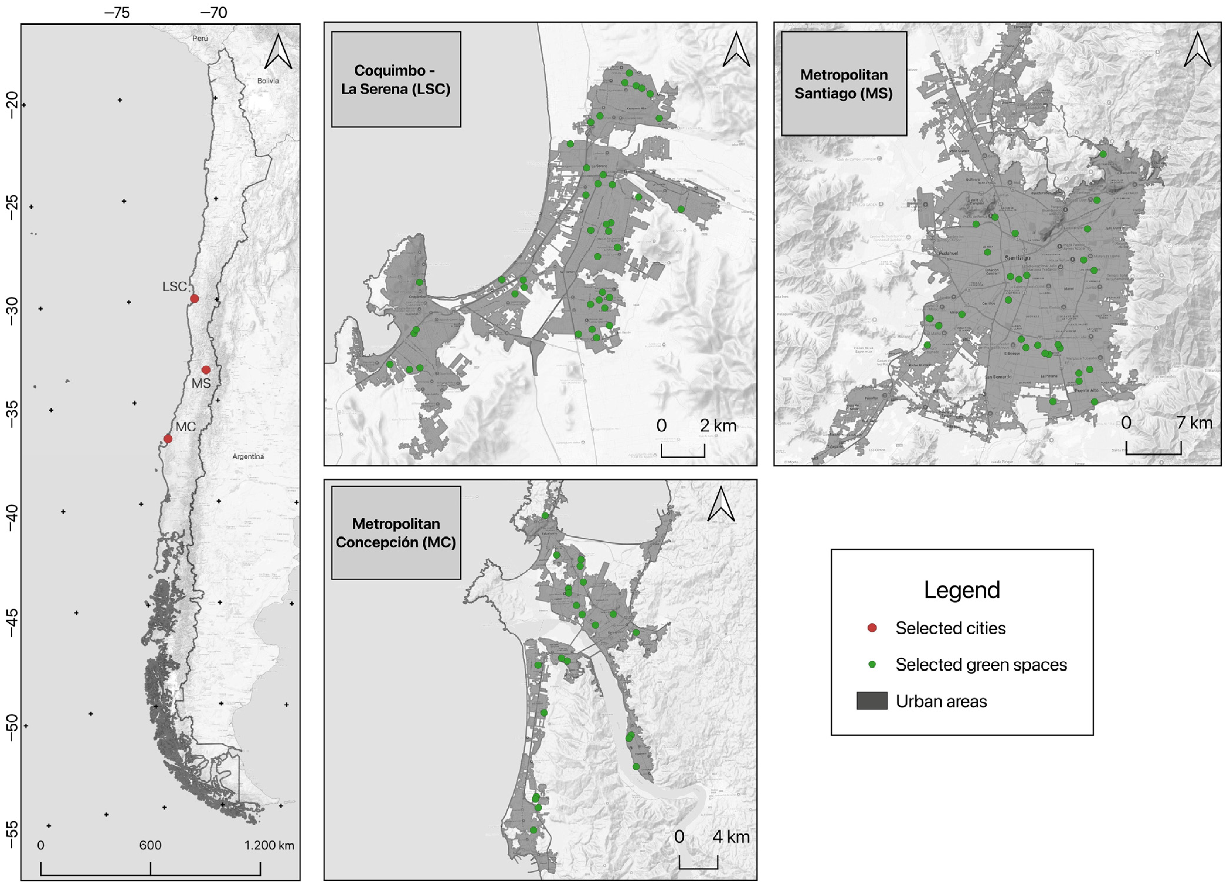 Location of the three cities analyzed and the 94 urban green spaces under study. Two communes in La Serena-Coquimbo (LSC), 18 communes in Metropolitan Santiago (MS) and 6 communes in Metropolitan Concepción (MC) were visited.