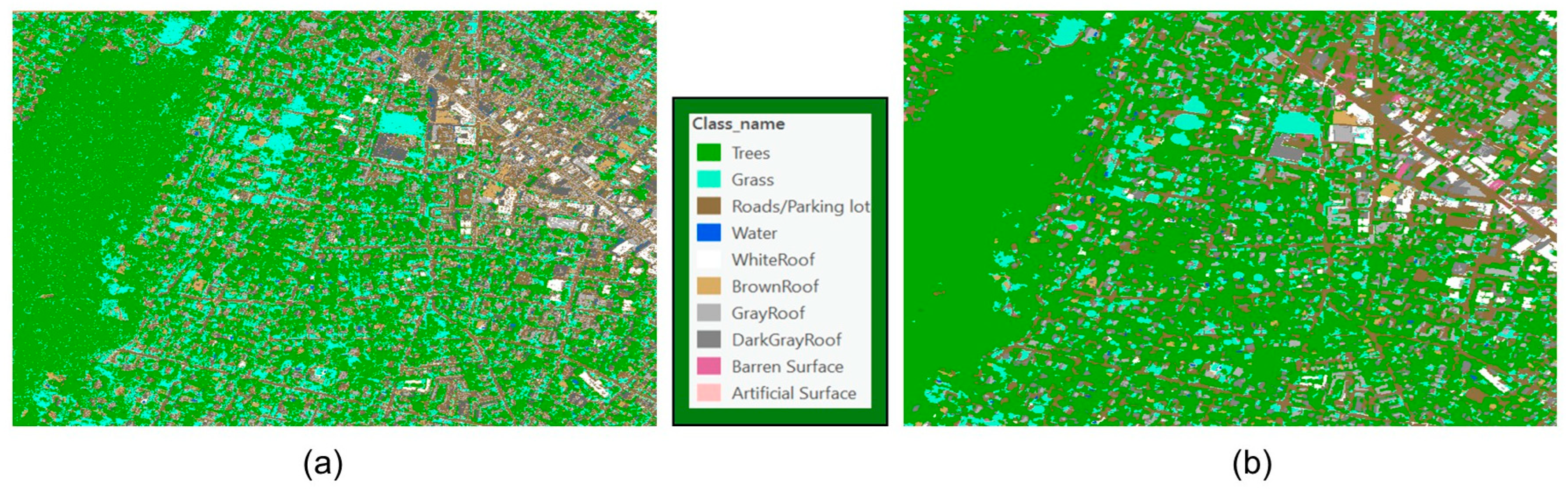 Aerial imageries with a 30 cm spatial resolution were obtained from the USA NAIP multispectral digital orthophoto database for both study sites. Supervised classification was utilized following the previous fine-scale study [27] to identify a set of environmental elements comparable to those identified from street view images. Both pixel-based image classification and object-based image classification were experimented with using ArcGIS Pro 3.0. Training samples were digitized as polygons to capture variant instances of the major environmental elements present in the two study sites, including trees, grass/lawn, roads, rooftops, barren land, water, and artificial surfaces. Rooftops had subclasses with different colors. The Maximum Likelihood Classification (MLC) method was first used following previous studies [27,28]. The Support Vector Machine (SVM) classifier built in ArcGIS Pro 3.0 was also tested. While MLC assumes normal distribution and classifies pixels by maximizing probability, SVM is a non-parametric classifier that seeks an optimal separating hyperplane to maximize the distance between each class in an N-dimensional space, making it more robust to non-normal distributions and complex datasets. A range of settings of spectral and spatial details and minimum segment sizes was also tested. Close visual inspections on the resulting maps were conducted to choose an optimal classified map for each site that required minor manual re-classifications.