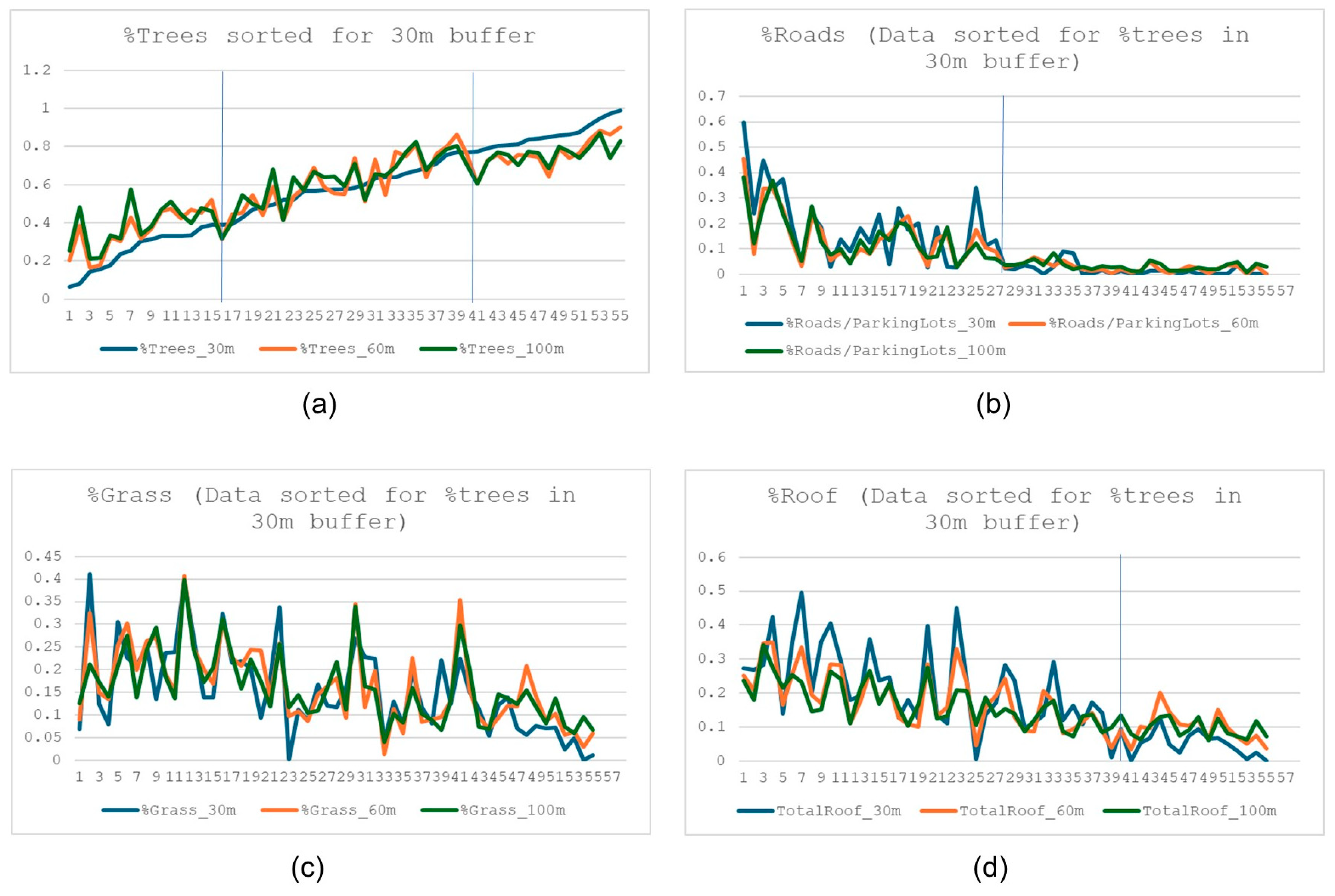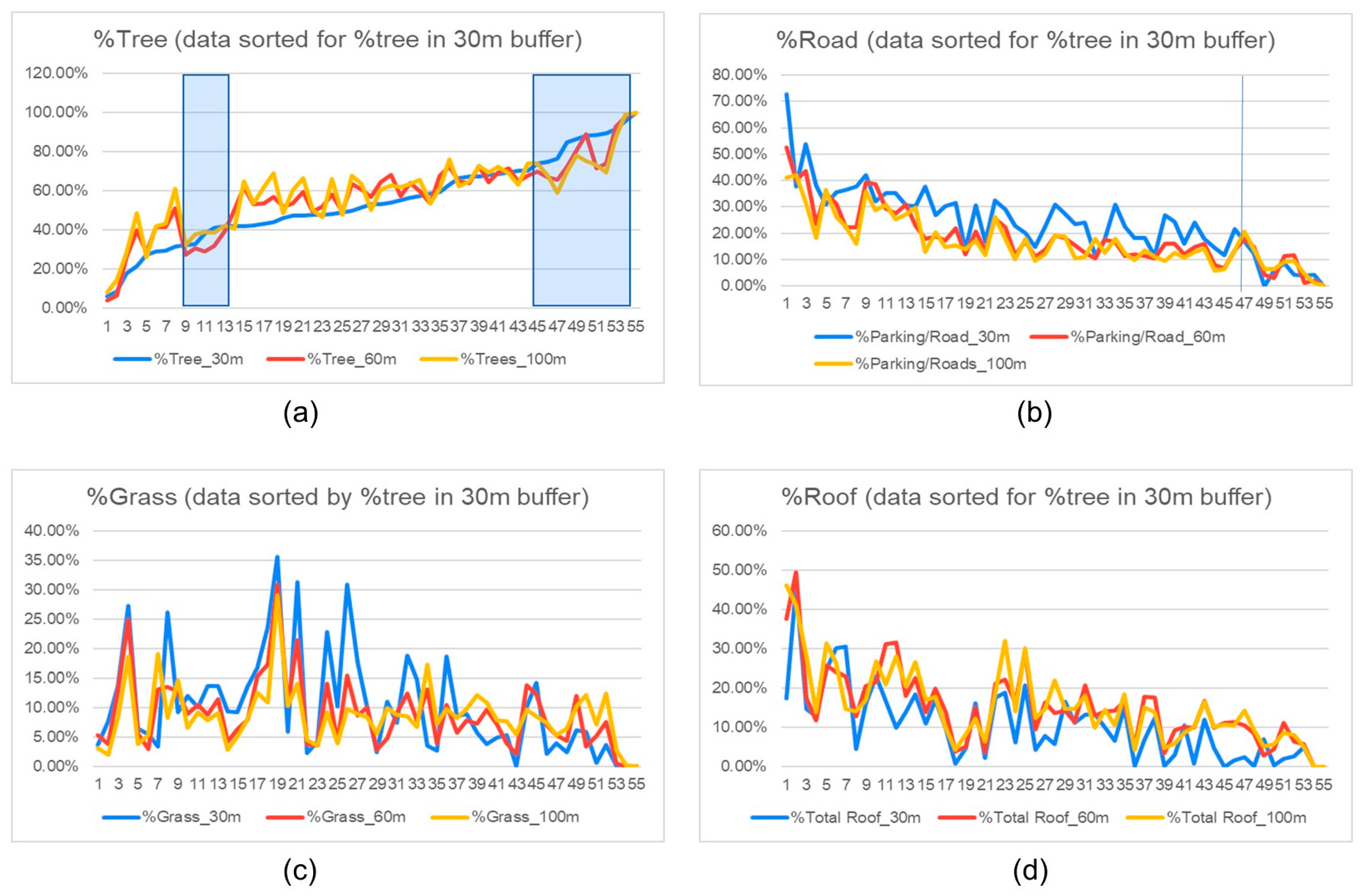 To examine the effects of different environmental settings in more detail, we created Figure 12 which shows two maps differentiating sample locations in slightly different environmental settings. In Figure 12a, the green dots on the image are locations with less than 30% tree coverage when using the 30 m buffers in the chart below. The map shows that they are in areas with the least greenness in this study site. These locations show greater tree percentages with the larger buffer sizes (60 m and 100 m) than the small buffer (30 m), as shown in Figure 4a (as shown to the left of the first blue line). This could be because when the immediate environment has extensive pavements (roads and buildings), expanding the buffer allows for more greenness in the less than immediate vicinity to be accounted for. The red dots on the image are locations with more than 80% tree coverage when using the 30 m buffers in the chart below. The map shows that they are located in areas with the highest level of greenness in this study site. At these locations, the percentages of tree coverage are higher when using the 30 m buffers than the 60 m and 100 m (Figure 4a, right of the second blue line). This is because when there are a lot of trees in the neighborhood, the tree canopies cover much of the rooftops on the sides of the streets in the immediate environment. Expanding the buffers allows more buildings to be accounted for. This is confirmed by Figure 4d, in which the 80% tree coverage is also the threshold for rooftops. The gray dots are in between, where all three buffer sizes show comparable tree percentages.