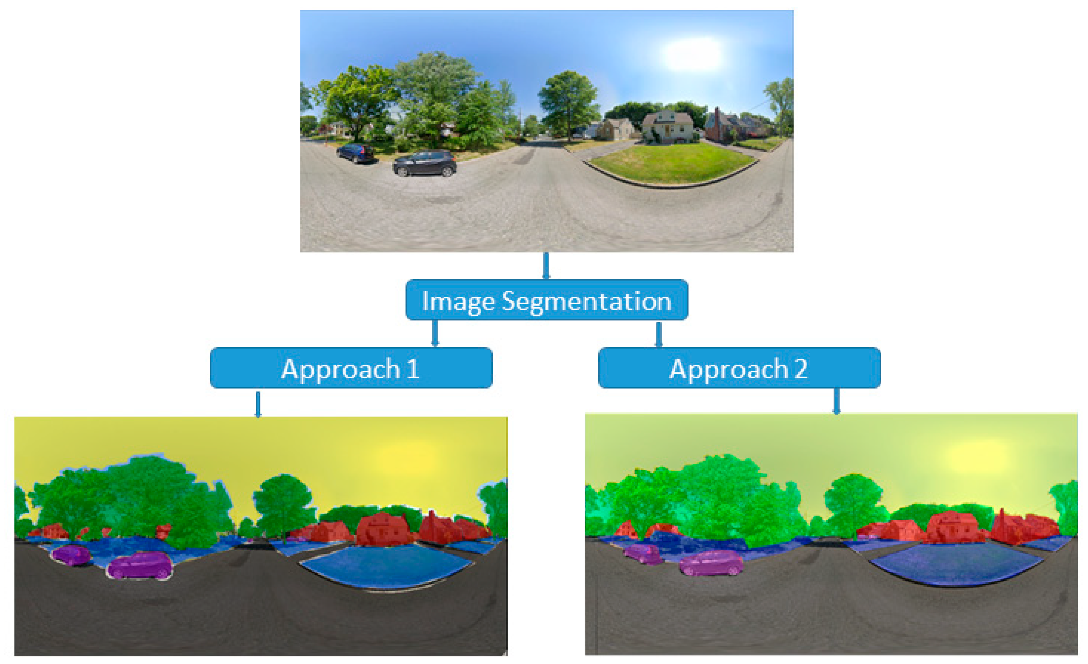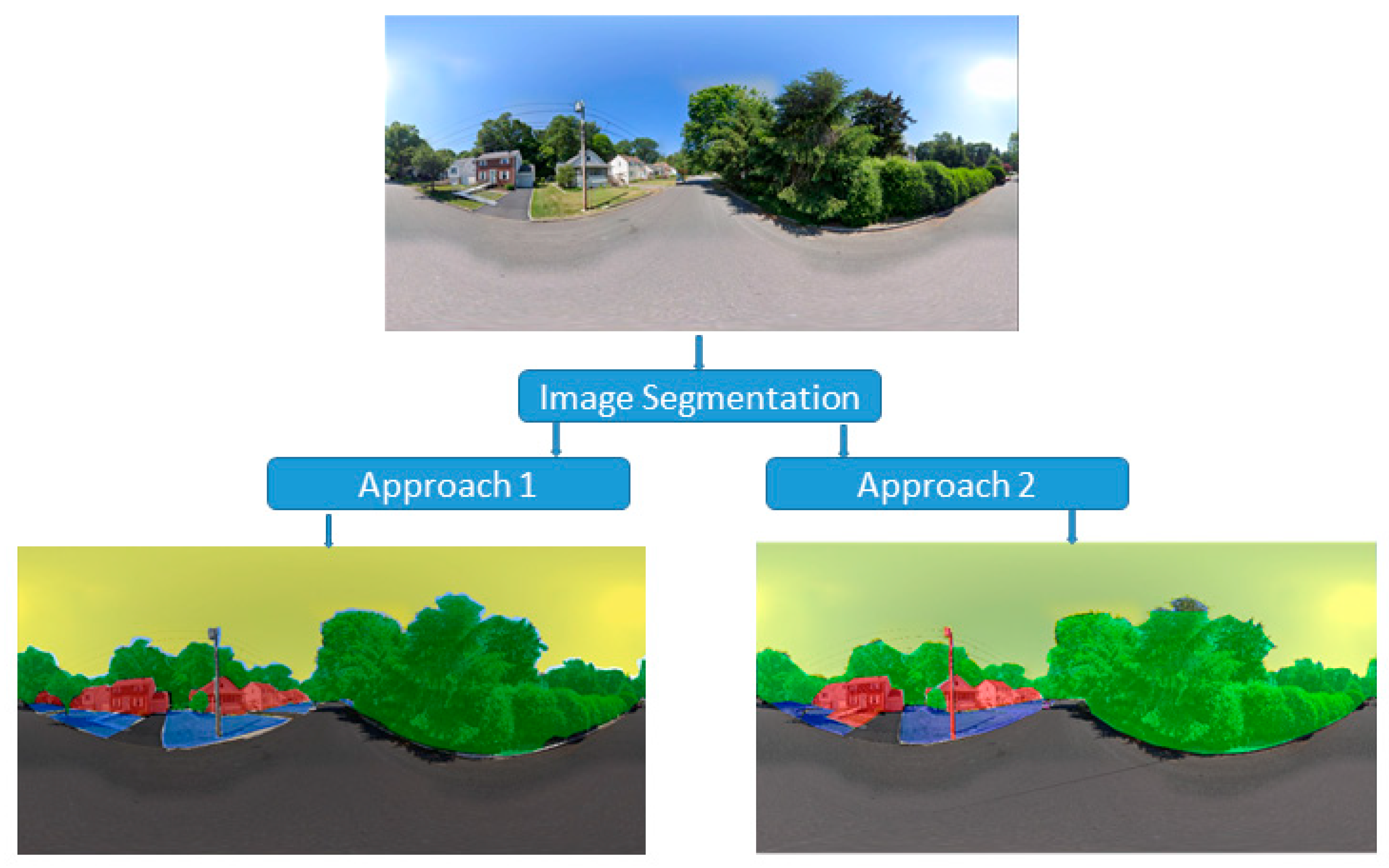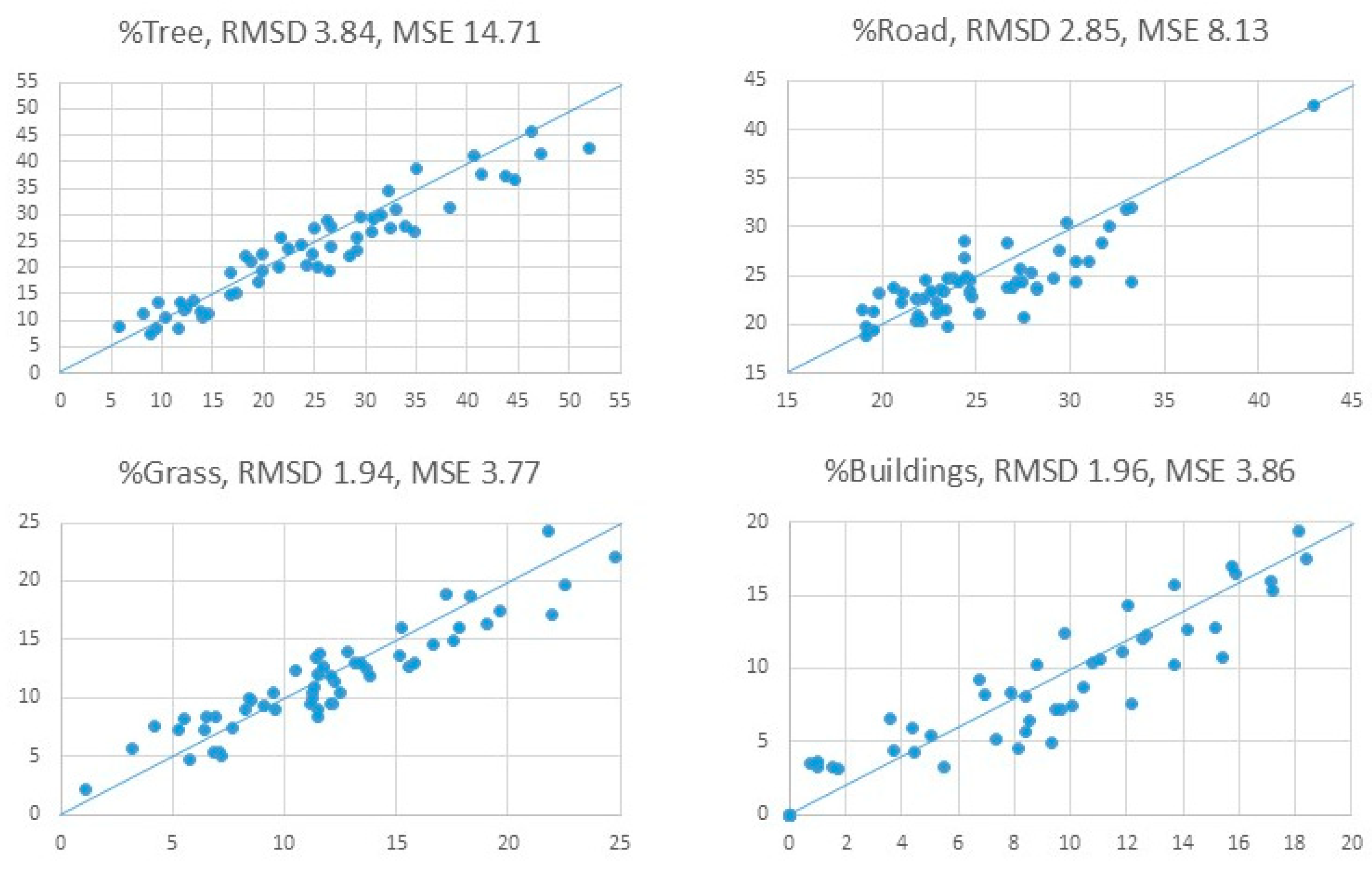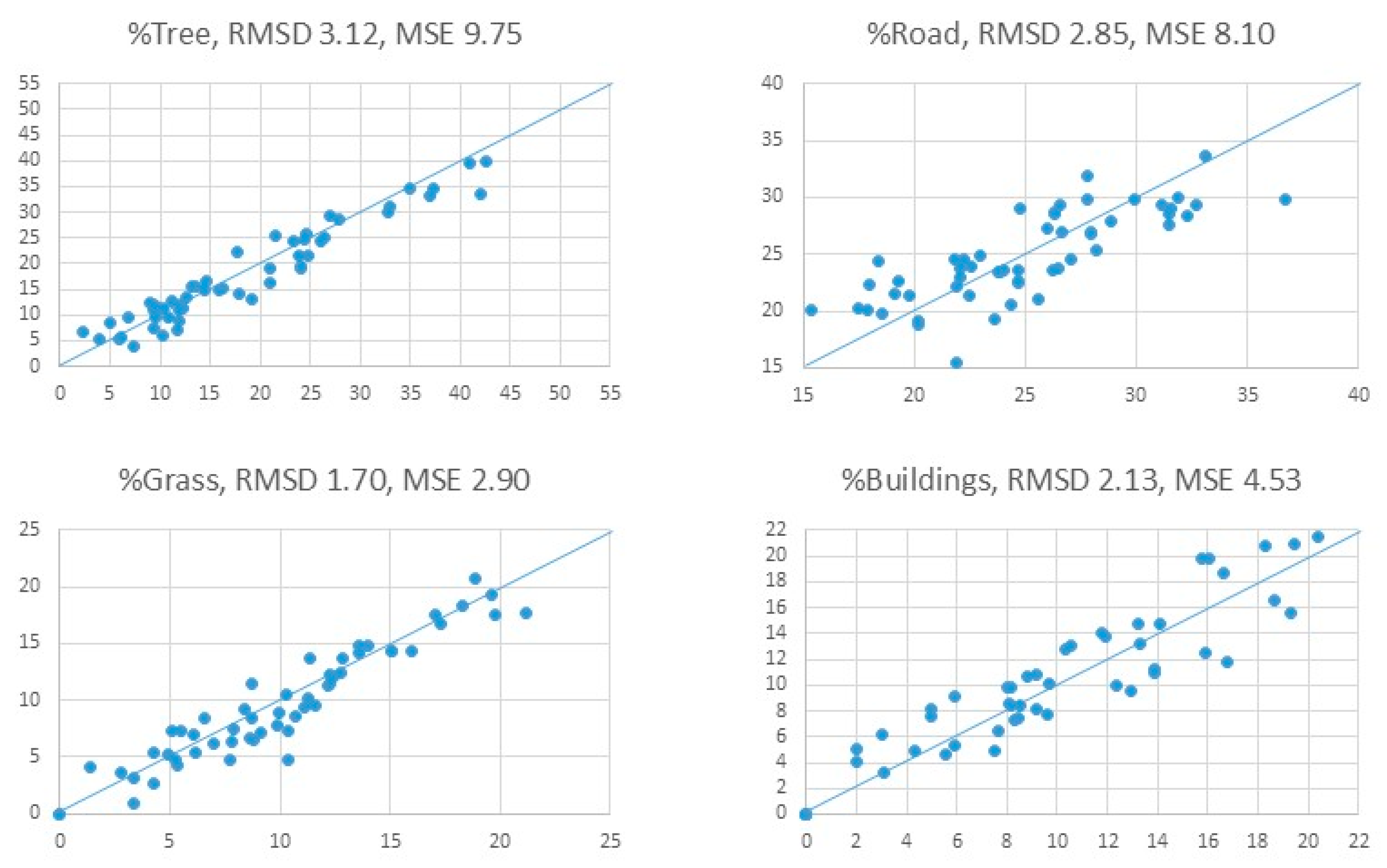 Figure 6 and Figure 7 show the segmented images of two GSVs in our samples using the two image segmentation approaches. The two results bear a good level of similarity. One notable difference is that the edges of treetops are segmented as grass when using the first approach. Figure 8 and Figure 9 show the scatterplots comparing the results of the two image segmentation approaches for study sites 1 and 2, respectively. We focused on the four major environmental elements in the aerial images. It is observable that the two approaches are agree more with regard to the natural elements, like trees and grass, than the artificial elements, like roads and houses. There is a higher degree of agreement for the natural elements in site 2 than in site 1 according to the calculated RMSDs. It is the opposite for artificial elements, for which site 1 shows a higher degree of agreement, especially with regard to the percentage of roads.