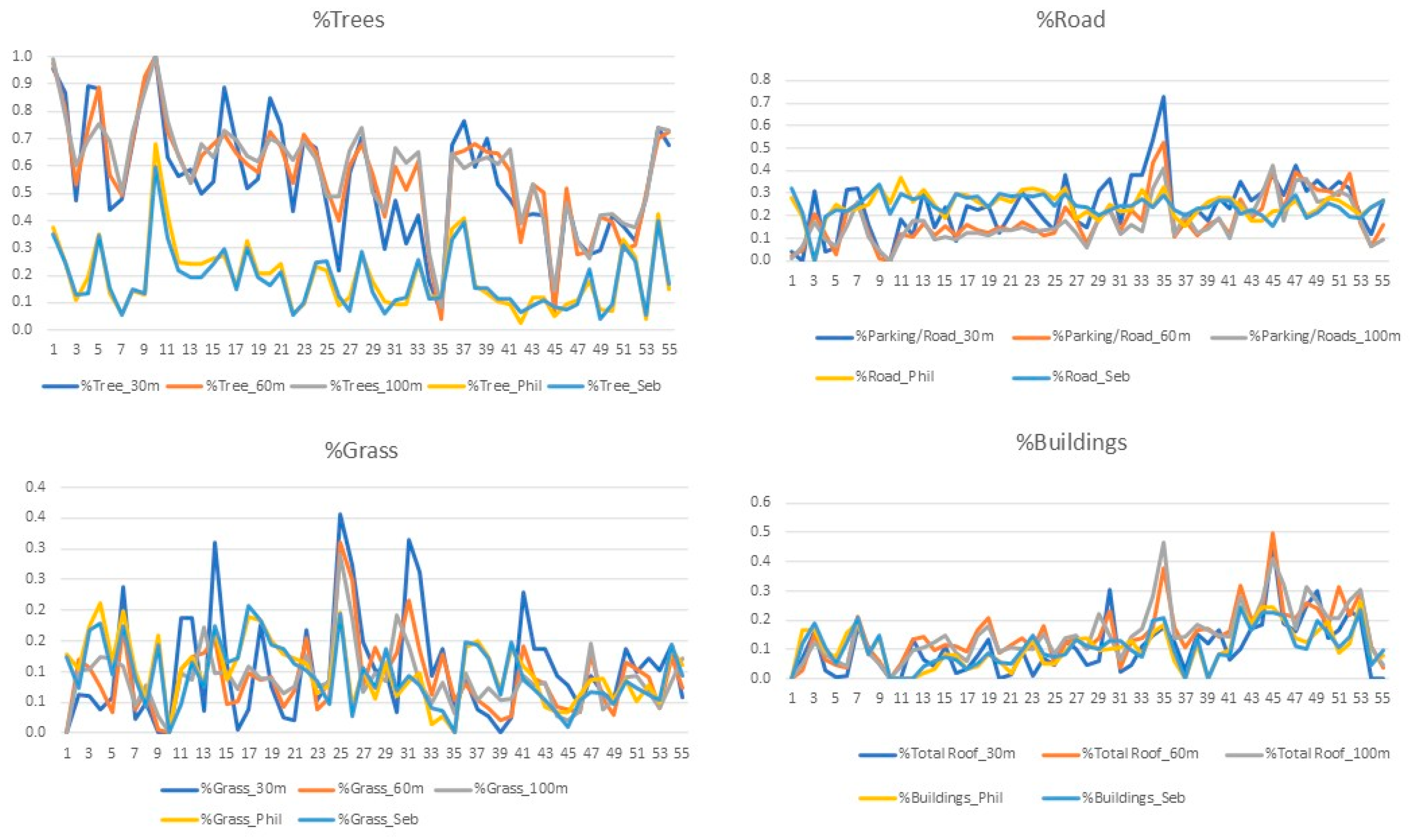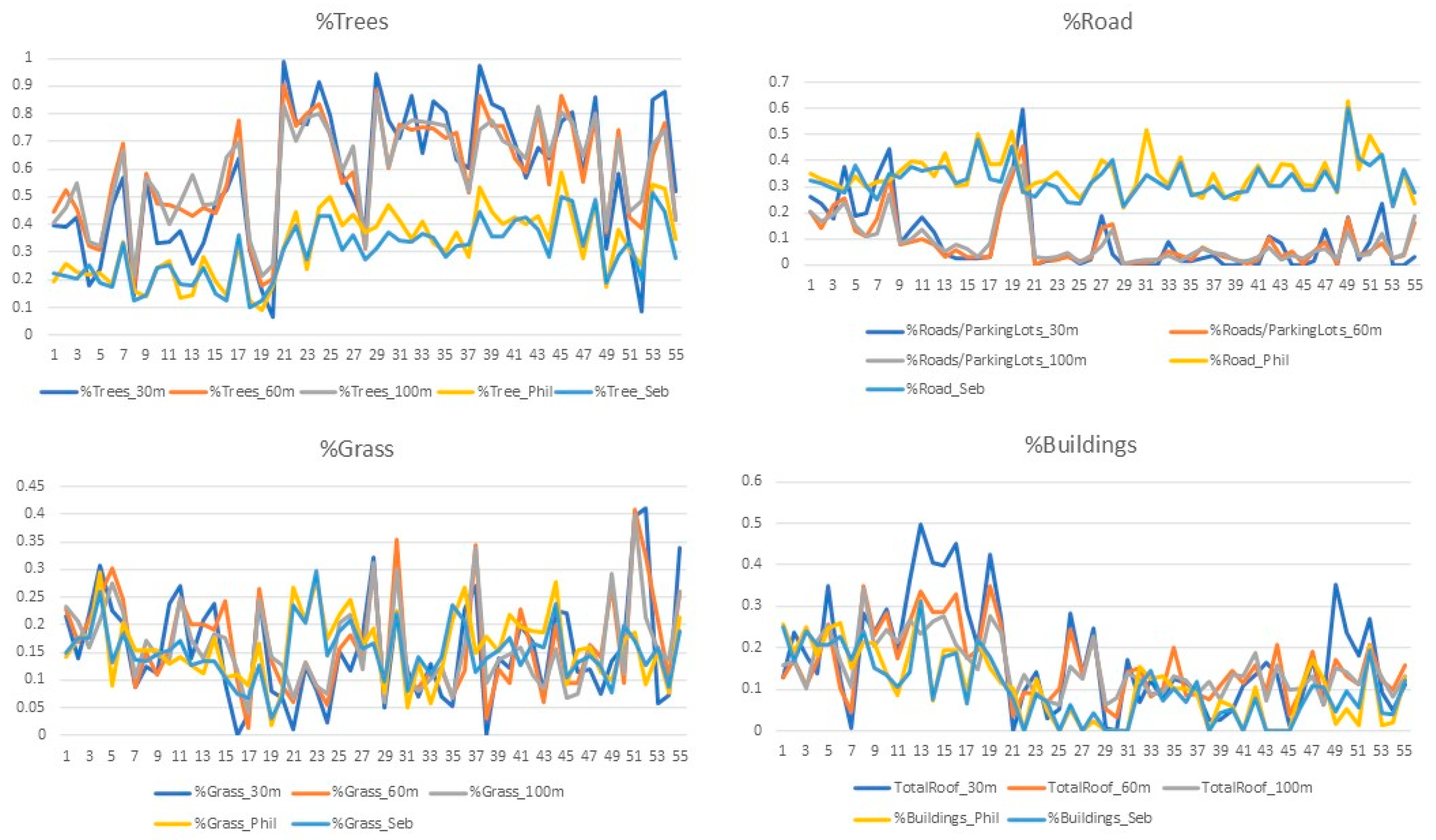 Figure 4 shows the proportions of four major environmental elements calculated within the three buffer sizes in study site 1. The amount of water, barren land, and artificial surface are quite limited in the study site and thus we did not include them in the figures. We grouped different colored rooftops together to account for all buildings. The data is sorted according to the percentage of trees with the 30 m buffer size. Table 1 lists the average proportions of these environmental elements with different buffer sizes. The table includes water, in order to show its limited amount. It is noted that the average proportions of the natural elements, trees, grass, and water generally increase with the increase in buffer sizes. The proportions of the artificial elements, rooftops, and roads show opposite trends. The overall differences among the three buffer sizes are not significant. Both Table 1 and Figure 4 also show that the proportions of these various environmental elements calculated using the 60 m and 100 m buffer sizes are very similar. For trees, when the tree coverage is between 40% and 80% (based on the 30 m buffer), all three buffer sizes show similar results. When the environment has little tree coverage (<30%), larger buffer sizes, such as 60 m and 100 m, lead to higher proportions of trees in the calculation than the 30 m buffer. When the environment has extensive tree coverage (>80%), the larger buffers lead to lower percentages of trees. It is also observed that less tree coverage tends to lead to higher percentages of rooftops when using a small buffer (30 m) compared to the larger ones (60 m and 100 m). With extensive tree coverage (>80%), the differences among buffer sizes diminish. Roads and grass do not show similar consistent trends.