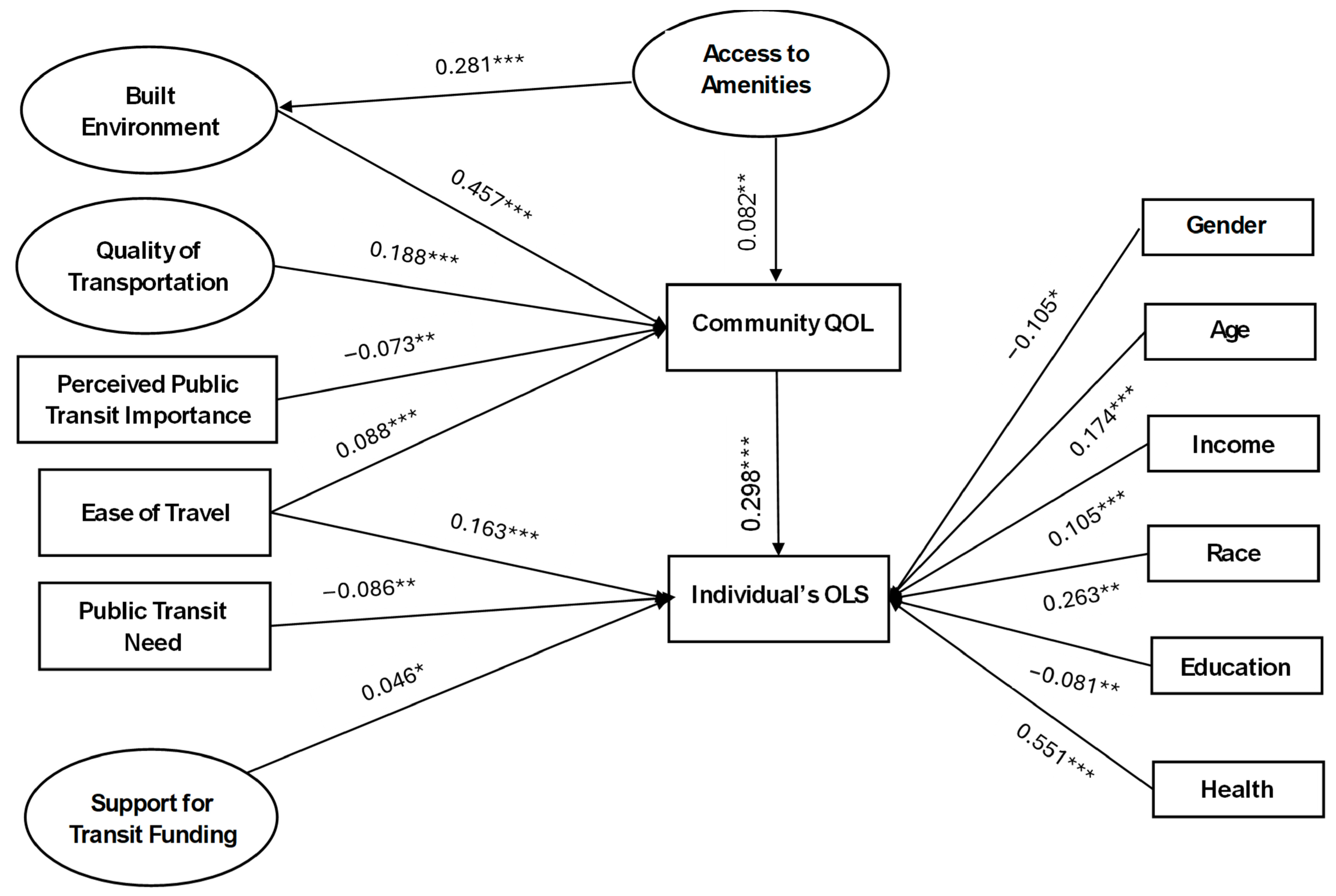 These findings align with expectations, as the built environment, access to amenities, and quality of transportation represent broad societal indicators and therefore have a strong direct impact on community QOL. In contrast, support for transit funding reflects an individual’s perception of public transit funding from external sources (city, county, state, or federal) and has a significant direct effect on individual OLS.