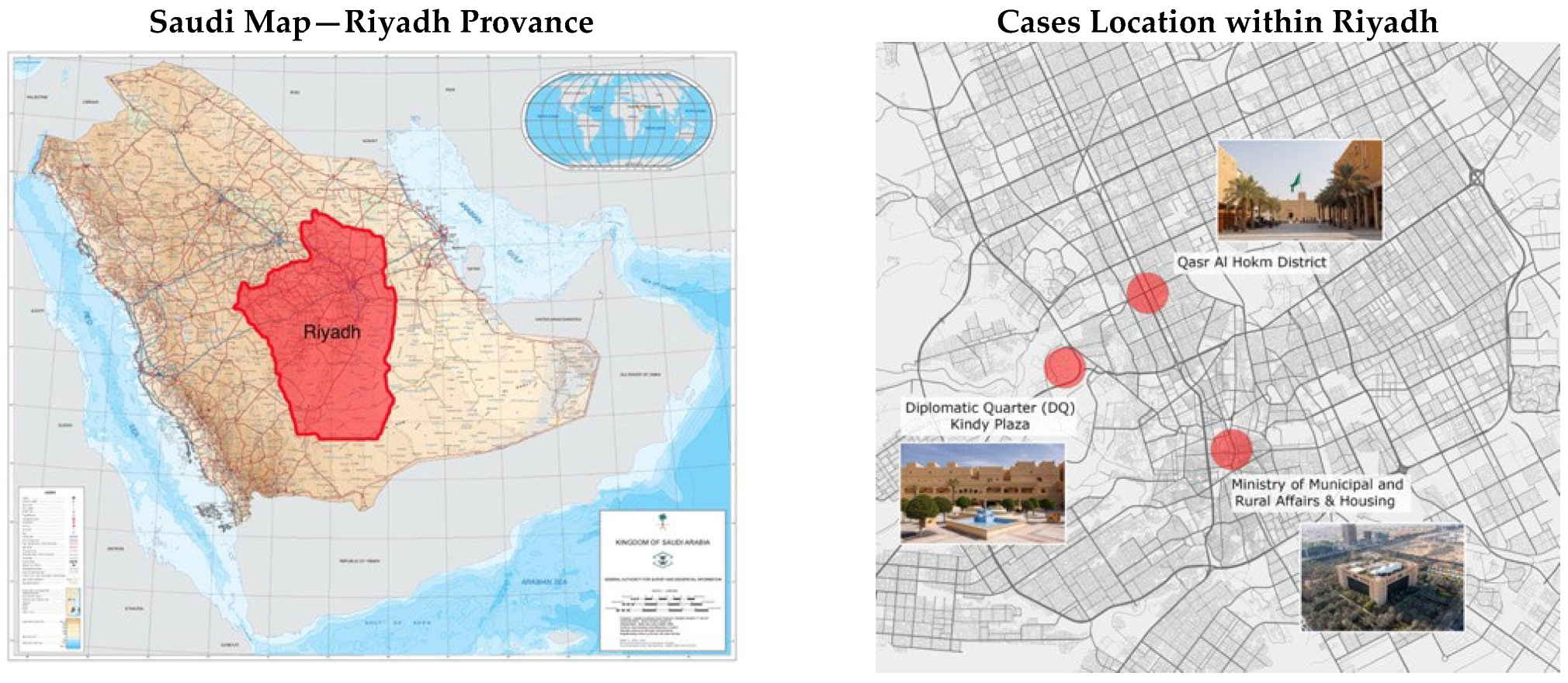 This research adopted a qualitative multiple-case study approach to examine how open-space architectural projects shaped Riyadh’s urban life (1980s–1990s). The method enables the deep analysis of complex socio-spatial phenomena within their cultural context [60]. Studying multiple cases provides both individual depth and comparative insights, offering robust empirical grounding while maintaining analytical flexibility for cross-case examination.