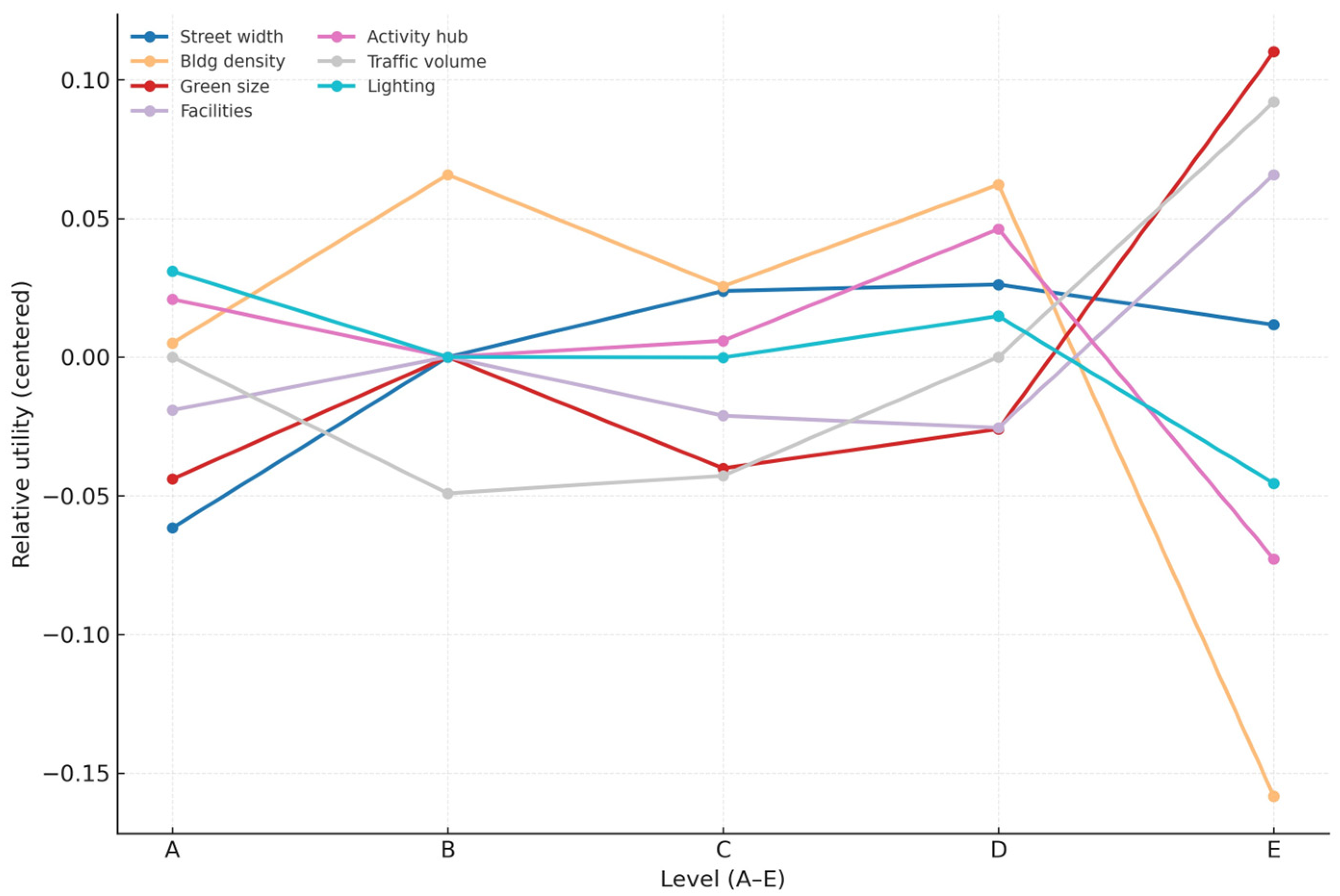 | B (Public—short) | Use preference and satisfaction | Walkability; Rest/play; Visual comfort | 6 | 1 | 5-point Likert (1–5) | Strongly disagree → Strongly agree | Choose this route daily; stay comfortably | Utilitarian vs. amenity choices | Placed after A to reduce anchoring |