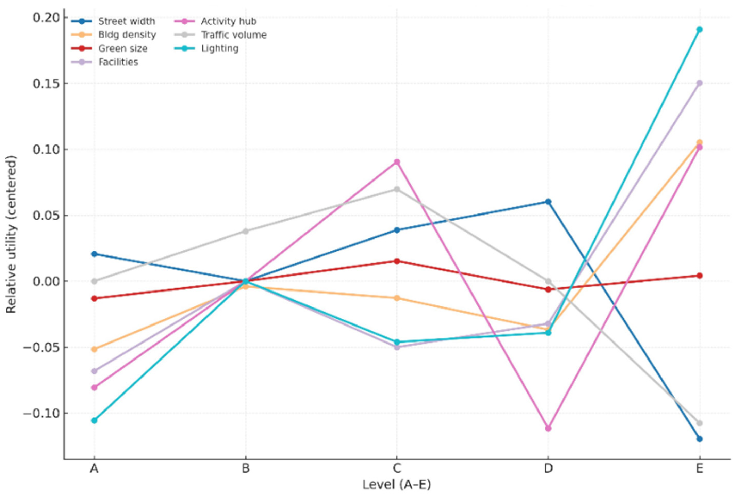 | B (Public—short) | Trade-offs of safety/ comfort | Lighting; Shade; Width priorities | 5 | 2 | 5-point Likert (1–5) | Strongly disagree → Strongly agree | Prefer stronger lighting even with glare (R); prefer more shade even if narrower | Elicits marginal preferences | Mirror- polarity pairs |