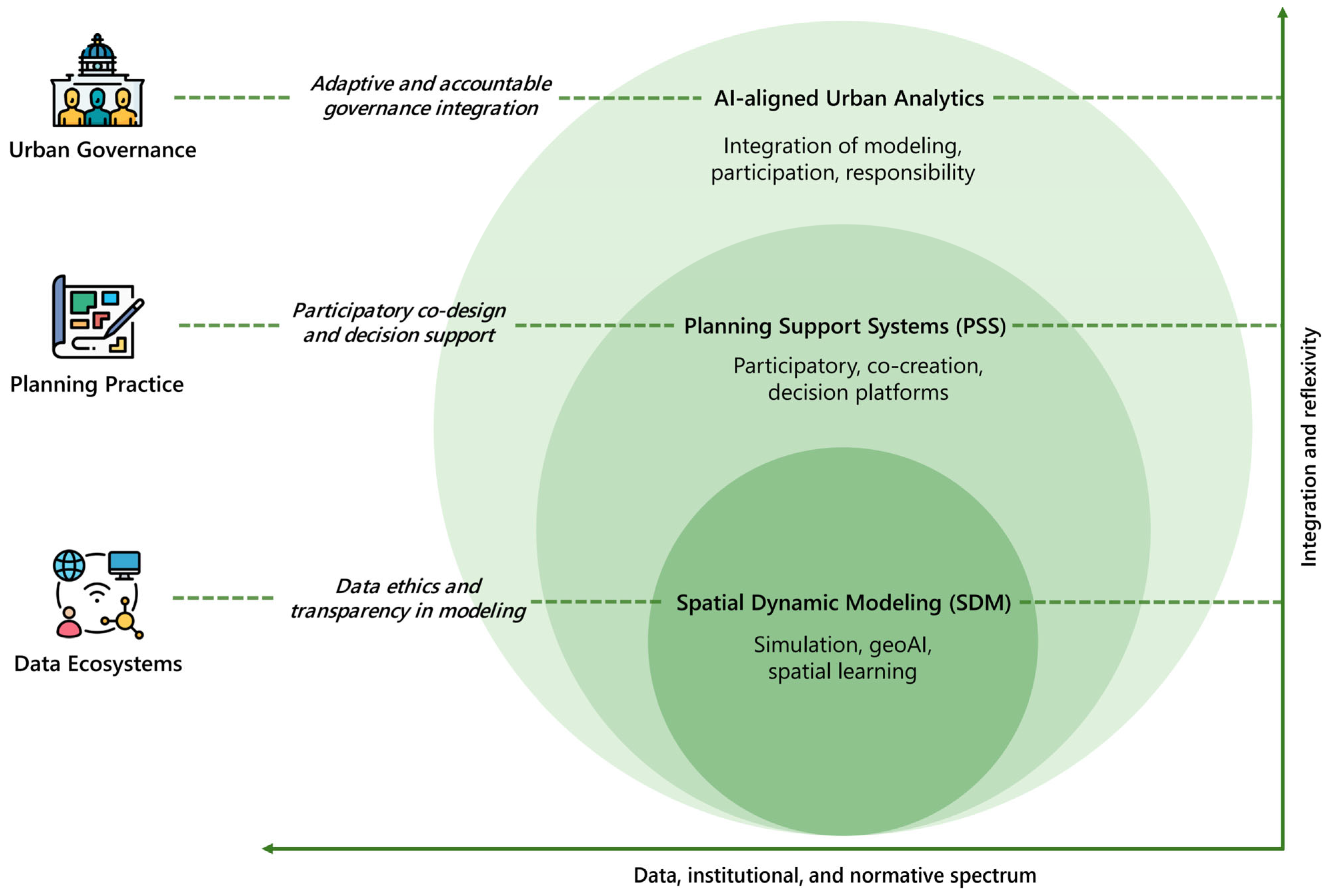 | Decision-support and planning tools | planning support system; decision support framework; urban analytics platform; urban scenario modeling; participatory planning tools |