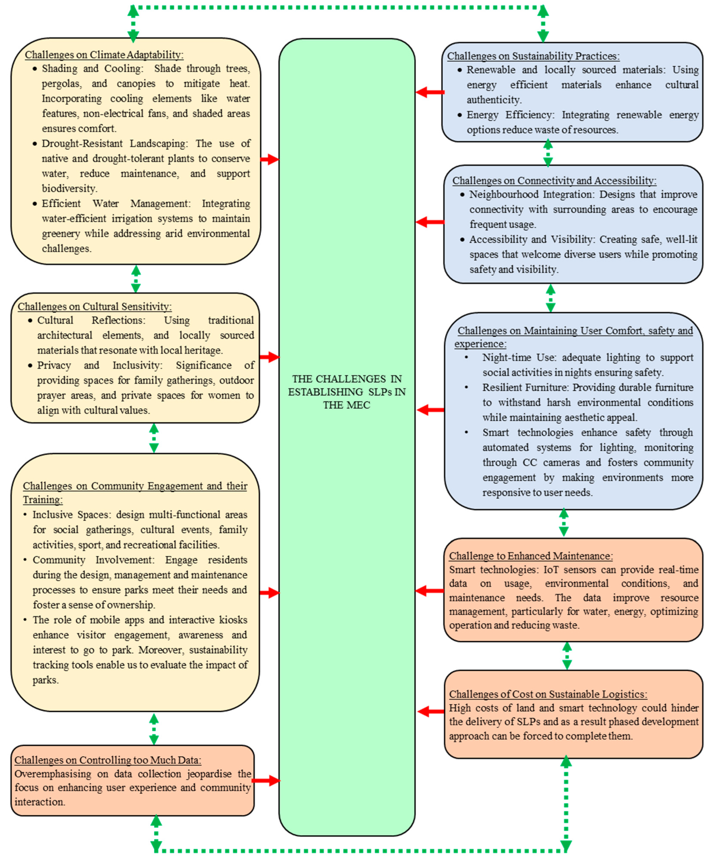 Experts shared the lessons that they had learned from projects designing SLUPs. Their collective insights underscore the critical importance of integrating community engagement, climate-conscious design, efficient resource use, and ongoing evaluation in creating urban community parks. The interviewees were asked to state the challenges in establishing SLUPs in MECs. Experts A and C–S identified development funds and governance as key issues, besides the need for sufficient financial resources and effective management frameworks. Experts B–E and J highlighted the harsh climate of the arid region as a significant obstacle, along with the high costs of implementing sustainable features, such as advanced irrigation systems and shading structures. Experts F, S, and T highlighted funding and resource limitations as major constraints. Experts E–R raised concerns about the high costs associated with sustainable materials and technologies, the limited availability of native plants suitable for the local climate, water scarcity for irrigation, the creation of shaded areas to combat heat, and the design of flexible spaces that can adapt to evolving community needs. Other challenges included the resistance to changes in traditional park designs and the difficulty of balancing aesthetic appeal with sustainability goals in a hot urban environment.