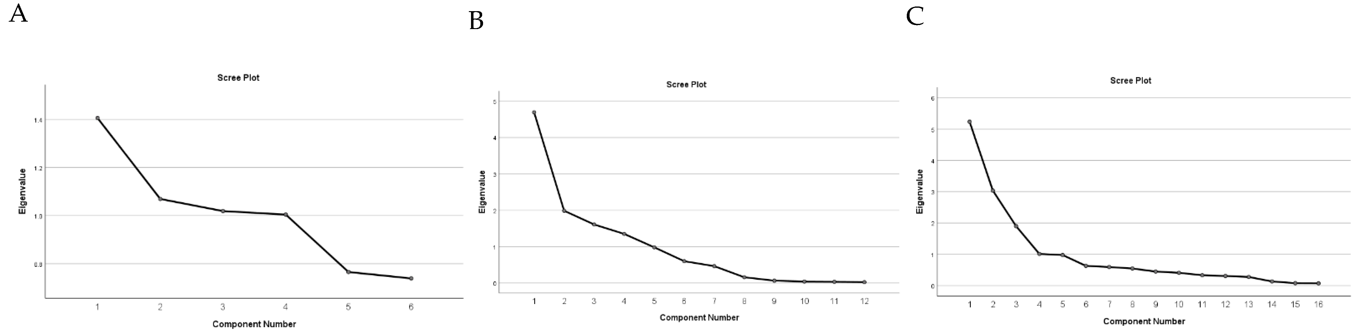 Figure 4 visually confirms factor numbers, and retaining four factors in all sections ensures a balance between parsimony and explanatory power. The variance explained was between 70 and 80%, indicating that these factors successfully captured most of the information in the dataset. The scree plot confirmed the four-factor solution, with a clear “elbow” after the fourth component, supporting the decision to keep these factors.