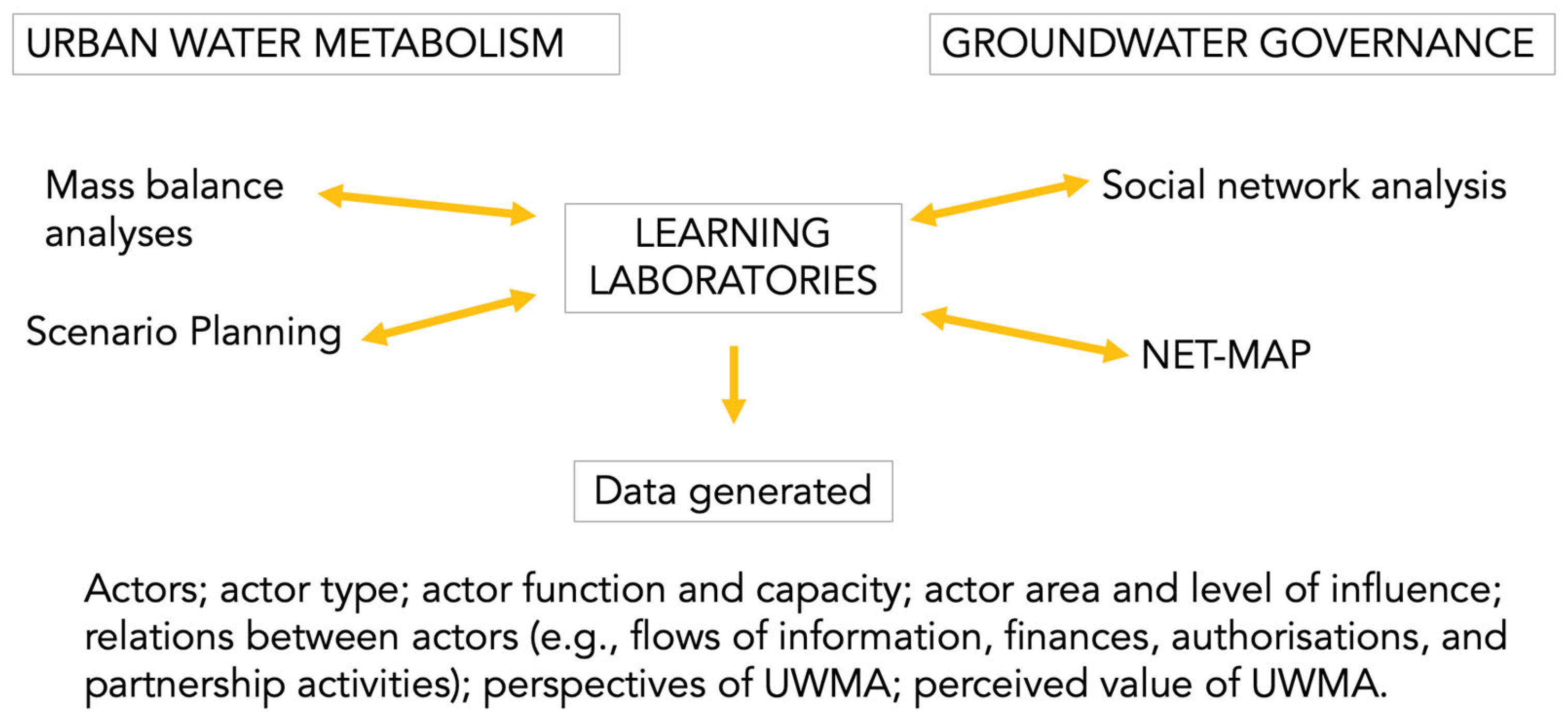 - Identifying knowledge needs and gaps. Governing groundwater involves diverse roles and responsibilities. UWMA supports urban planning in terms of understanding hydrological flows and opportunities to diversify and internalise water supply sources, as well as to quantify water use efficiency [29]. Metrics, performance indicators, and scenario planning help decision-makers identify knowledge needs for each role and responsibility and knowledge gaps, currently and what might be needed to make progress against water management aspirations. Transformative governance will create new roles requiring new knowledge and UWMA can identify these needs for drought preparedness and resilience.