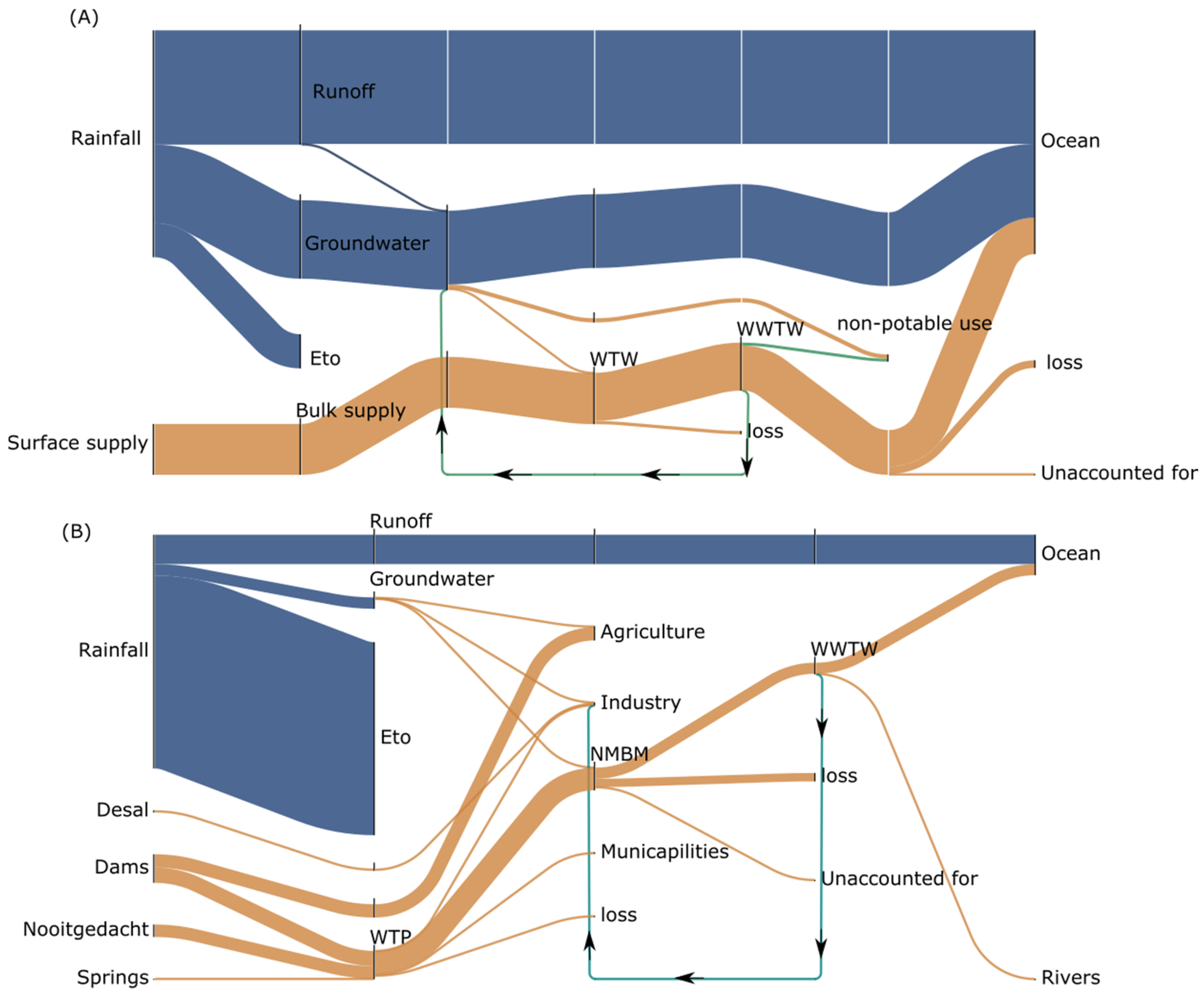 - Collate data on hydrological (precipitation, runoff, evapotranspiration, and groundwater recharge) and anthropogenic flows (surface supply/dams, desalination, inter-basin transfer, springs, groundwater, and recycled water) at annual timescales. Details for how the various parameters were calculated are given in Sections S1 and S2 of the Supplementary Material;
