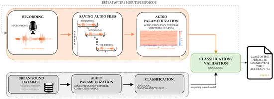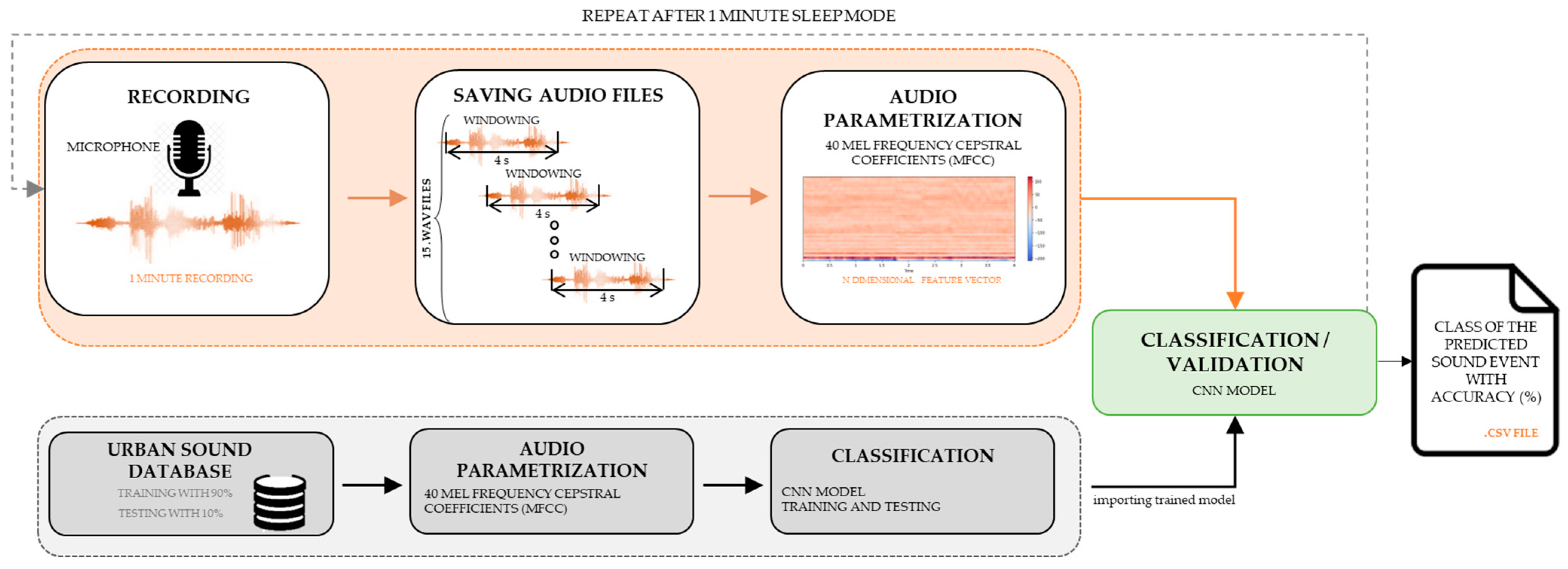 - Domazetovska Markovska, S.; Anachkova, M.; Pecioski, D.; Gavriloski, V. Advanced concept for noise monitoring in smart cities through wireless sensor units with AI classification technologies. In INTER-NOISE and NOISE-CON Congress and Conference Proceedings; Institute of Noise Control Engineering: Wakefield, MA, USA, 2024; Volume 270, pp. 2779–2790. [Google Scholar] [CrossRef]