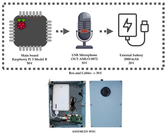 - Salvo, D.; Piñero, G.; Arce, P.; Gonzalez, A. A Low-cost Wireless Acoustic Sensor Network for the Classification of Urban Sounds. In Proceedings of the 17th ACM Symposium on Performance Evaluation of Wireless Ad Hoc, Sensor, & Ubiquitous Networks, Alicante, Spain, 16–20 November 2020; pp. 49–55. [Google Scholar] [CrossRef]