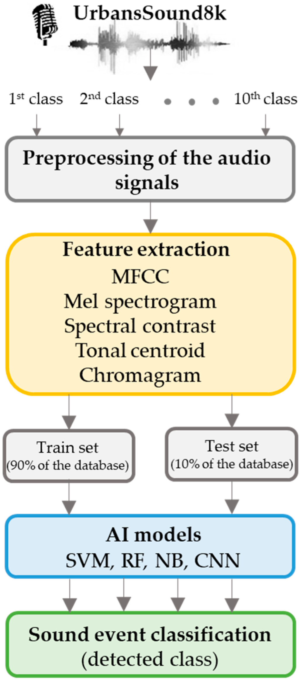 - Da Silva, B.; W Happi, A.; Braeken, A.; Touhafi, A. Evaluation of classical machine learning techniques towards urban sound recognition on embedded systems. Appl. Sci. 2019, 9, 3885. [Google Scholar] [CrossRef]
