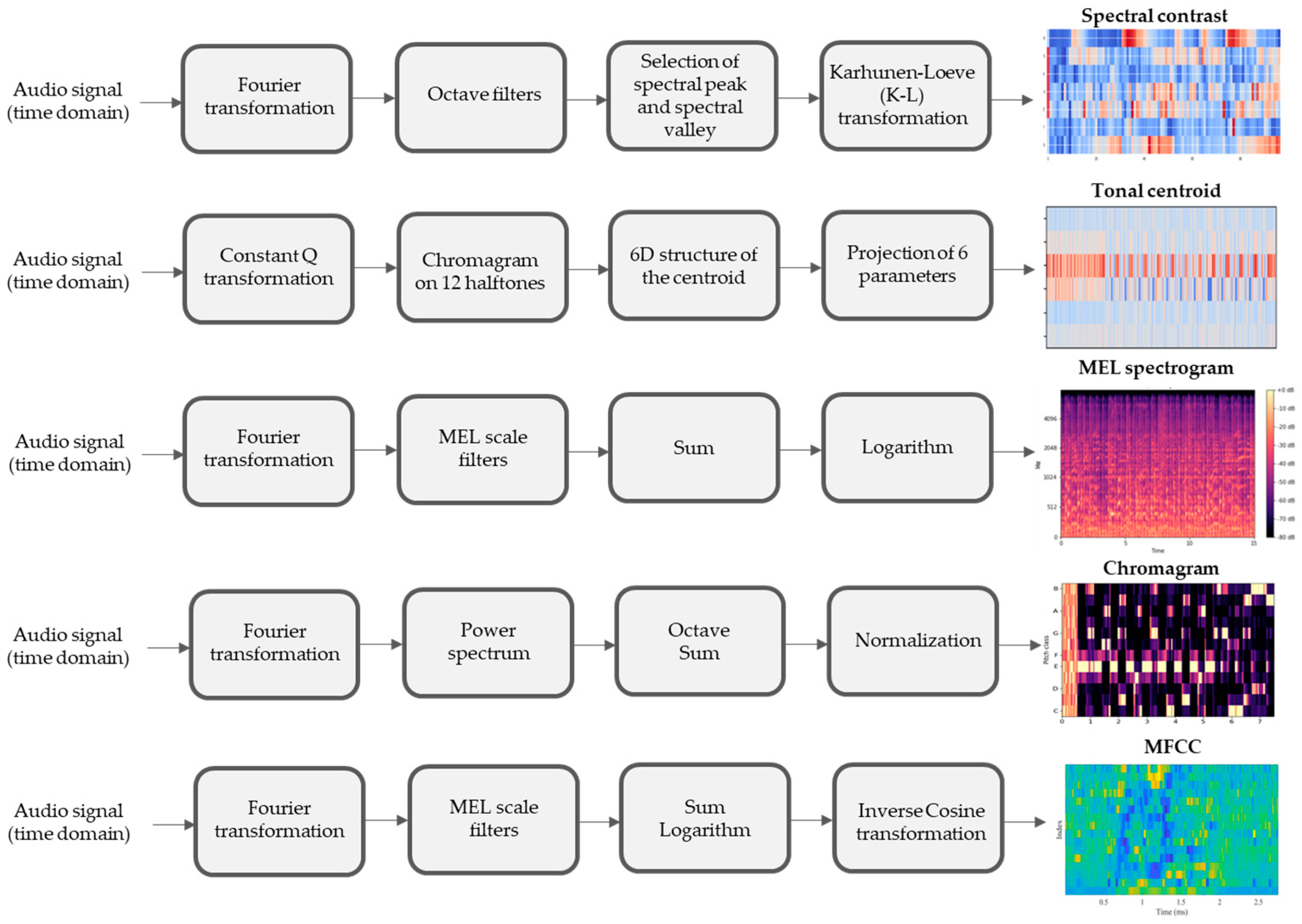 - Sharma, G.; Umapathy, K.; Krishnan, S. Trends in audio signal feature extraction methods. Appl. Acoust. 2020, 158, 107020. [Google Scholar] [CrossRef]