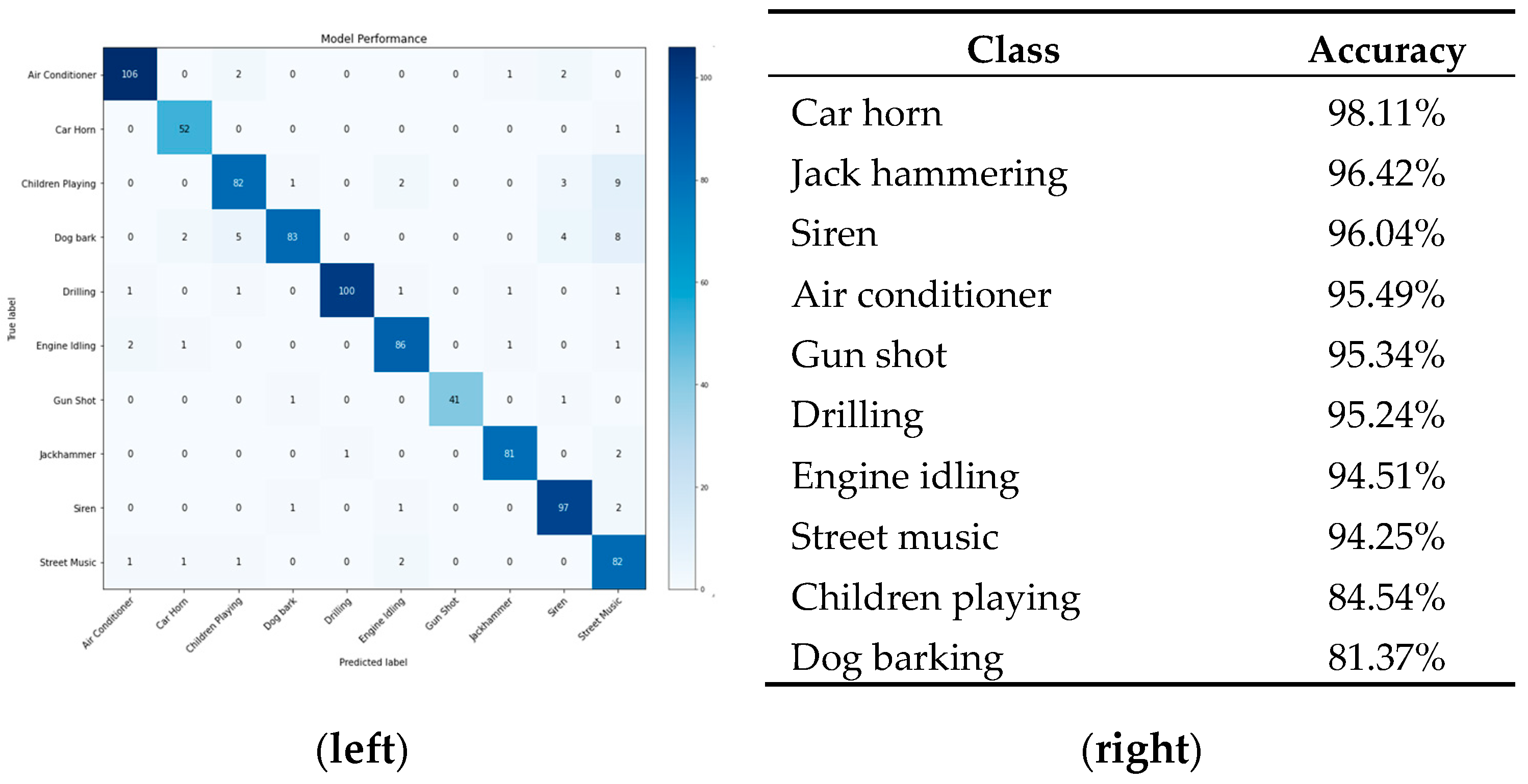 - Lakshmi, R.; Chaitra, N.C.; Thejaswini, R.; Swapna, H.; Parameshachari, B.D.; Sunil Kumar, D.S. Urban Sound Classification with Convolutional Neural Network. In Proceedings of the 2024 International Conference on Integrated Intelligence and Communication Systems (ICIICS), Kalaburagi, India, 22–23 November 2024; pp. 1–6. [Google Scholar]