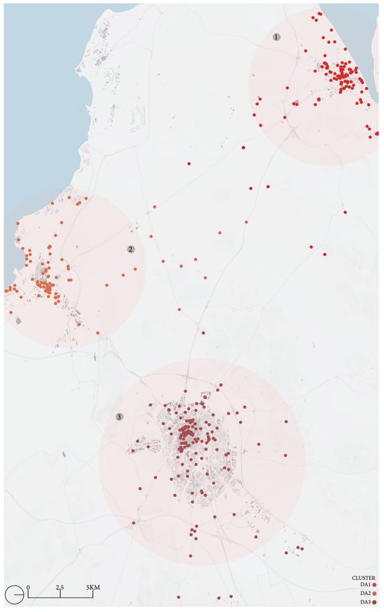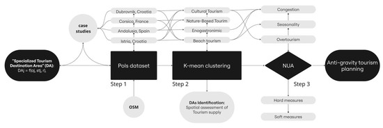In a second step, the georeferenced dataset was organized and classified according to the STESY model, which provides a standardized framework to capture the specific value chains of tourism and ensures comparability across territorial contexts. This categorization allowed for a coherent interpretation of the functional role of services and attractors within the tourism system. Subsequently, the identification of Destination Areas (DAs) was carried out through spatial clustering techniques. Through K-mean clustering, local clusters of functionally interrelated PoIs based on Euclidian proximity were identified and validated as Destination Areas, thus reflecting the territorial articulation of tourism supply within each case study. Finally, the identified DAs were interpreted through the lens of the New Urban Agenda, applying a downscaling approach to translate global principles of sustainability into context-specific strategies. The results are reported in terms of local anti-gravitational tourism development strategies, aimed at mitigating excessive tourism pressure and promoting more balanced and sustainable local development trajectories.