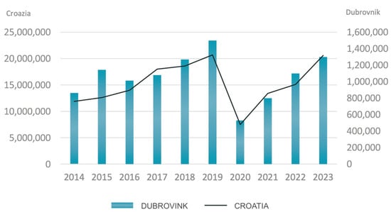National and local (Dubrovnik) Tourism arrivals from 2014 to 2023. Elaboration of Croatia National Tourism Statistical data. Source data: https://www.htz.hr/en-GB/tourism-information/tourism-analysis/ (accessed on 1 February 2025).