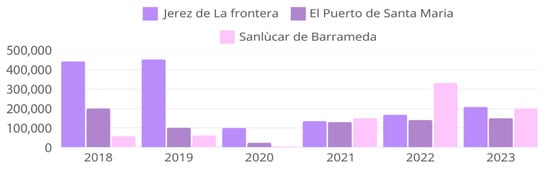 The figure shows the annual number of tourists visiting wine-related attractions (bodegas). Personal elaboration of municipal data. Sources: www.turismojerez.com, www.elpuertodesantamaria.es, https://sanlucarinformacion.es/, accessed on 1 February 2025.