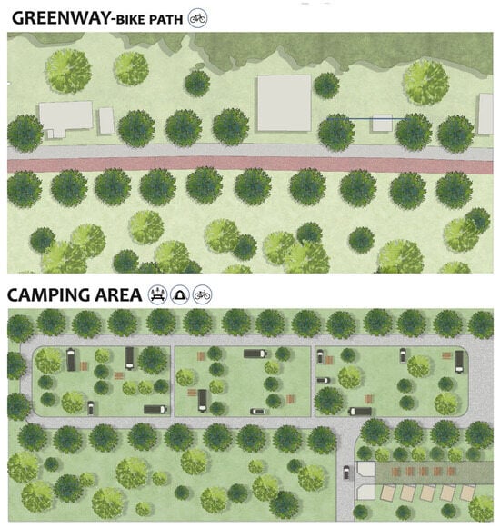 The greenway design (Figure 10) incorporates multiple gradients of difficulty, from accessible flat sections to more demanding mountainous stretches, enabling differentiated tourist experiences according to user profiles and mobility capacities. Estimated travel durations range from approximately 32–34 h on foot, 6–7 h by bicycle, and 3 h by car, underscoring the project’s capacity to accommodate diverse modes of slow and sustainable travel.