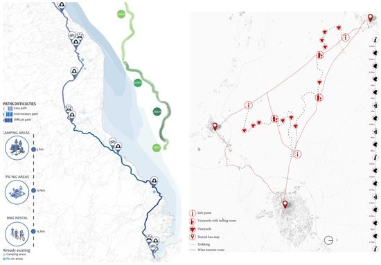 A key component of the proposed strategy concerns the strengthening of transport and mobility networks, with a particular emphasis on Sanlúcar de Barrameda, which currently suffers from limited accessibility and infrastructural gaps. Enhancing multimodal connectivity among Jerez de la Frontera, El Puerto de Santa María, and Sanlúcar is essential to reduce spatial disparities and foster a more integrated and equitable territorial system. This approach is consistent with the objectives of the New Urban Agenda [39] which promotes safe, sustainable, and universally accessible mobility systems as fundamental enablers of inclusive urban development. Complementing this infrastructural dimension, the strategy also envisions the creation of a pedestrian and experiential route crossing the region’s vineyard landscapes (Figure 11). Conceived as a form of slow tourism infrastructure, the route provides visitors with an immersive engagement with the territory’s cultural and environmental assets. Beyond its recreational purpose, the intervention contributes to the valorization of natural heritage and the expansion of inclusive public green spaces, reinforcing ecological connectivity while promoting sustainable and socially inclusive access to the rural landscape.