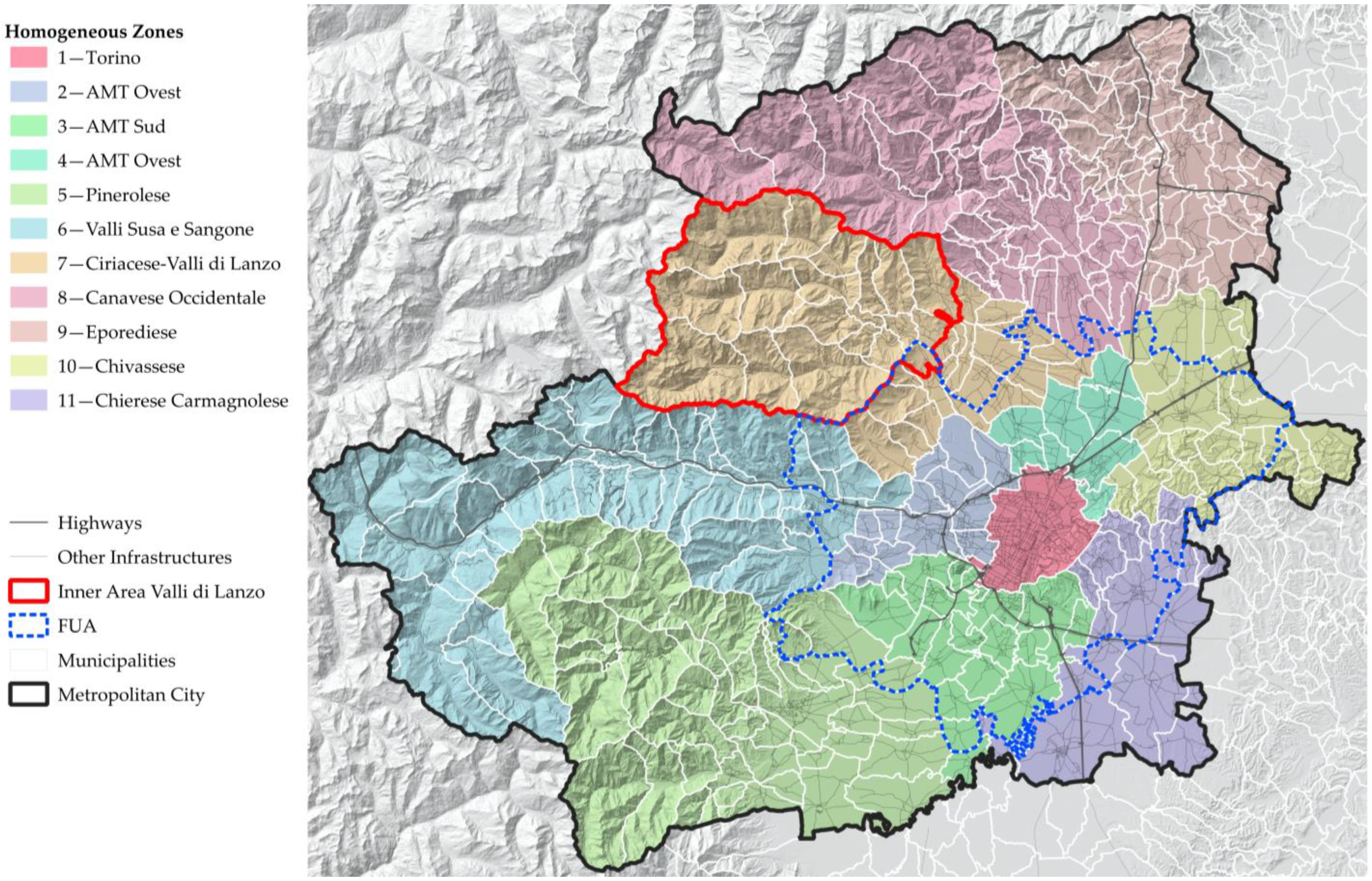 - Metropolitan City of Turin. Piano Territoriale di Coordinamento Provinciale 2/Provincial Territorial Coordination Plan 2. Relazione Illustrativa. 2011. Available online: https://www.cittametropolitana.torino.it/sites/default/files/pagina/allegati/Territorio/Pian_Area_Vasta/ptc2/PTC2_Rel_ill_dcr121_2011.pdf (accessed on 2 December 2025).