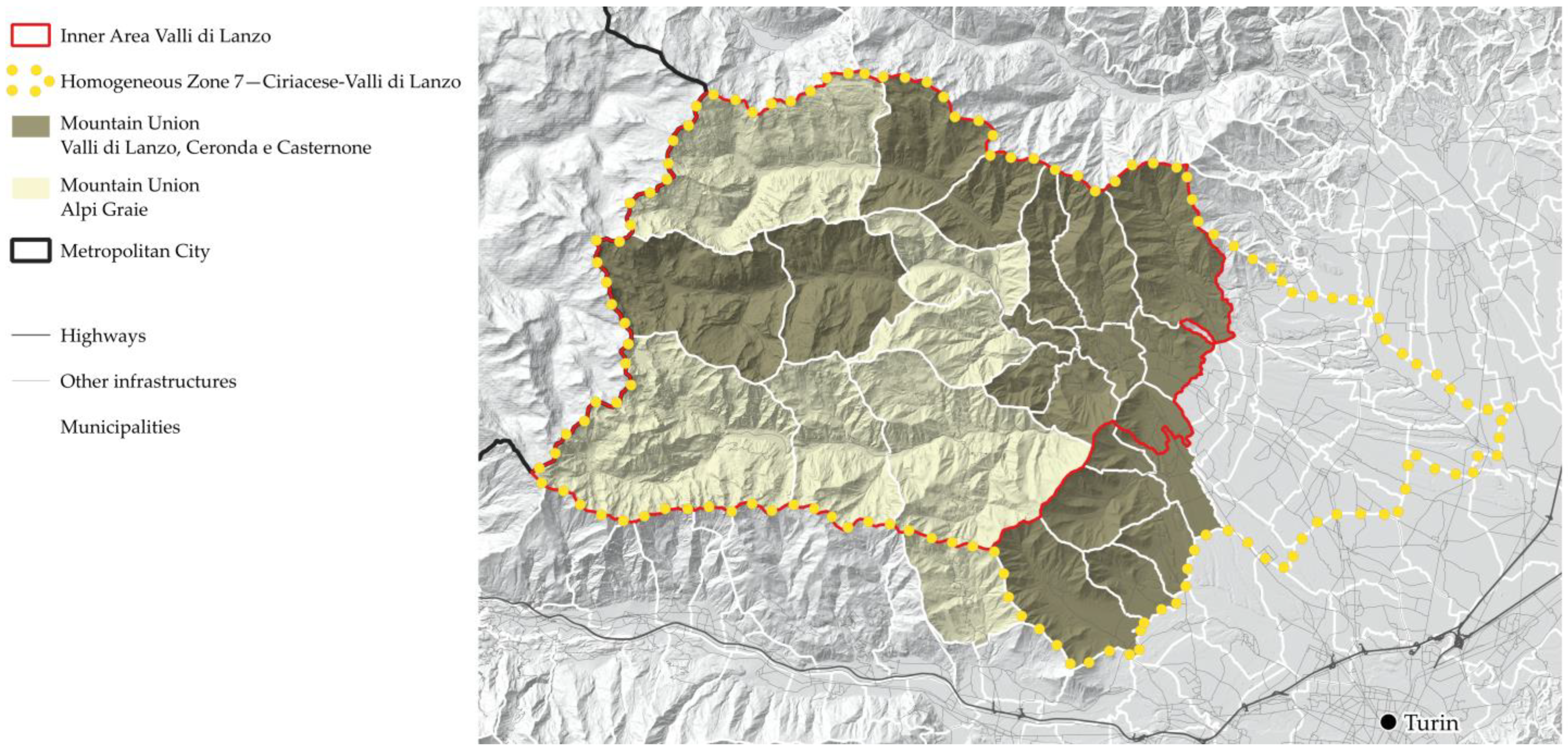 - Piedmont Region. Strategia Per le Valli di Lanzo: La Montagna si Avvicina. 2020. Available online: https://www.unionemontanavlcc.it/portals/1708/SiscomArchivio/8/Strategia_SNAI_Lanzo.pdf (accessed on 2 August 2025).