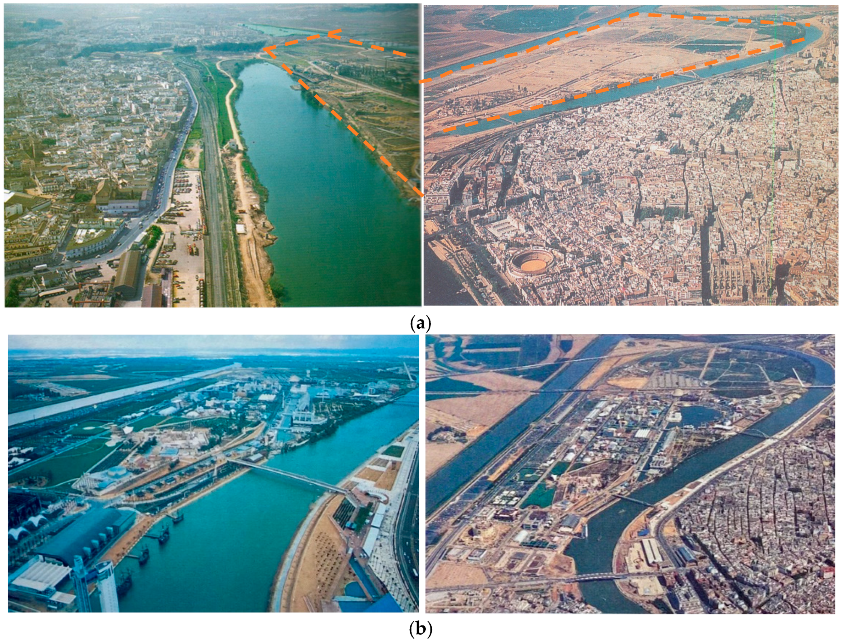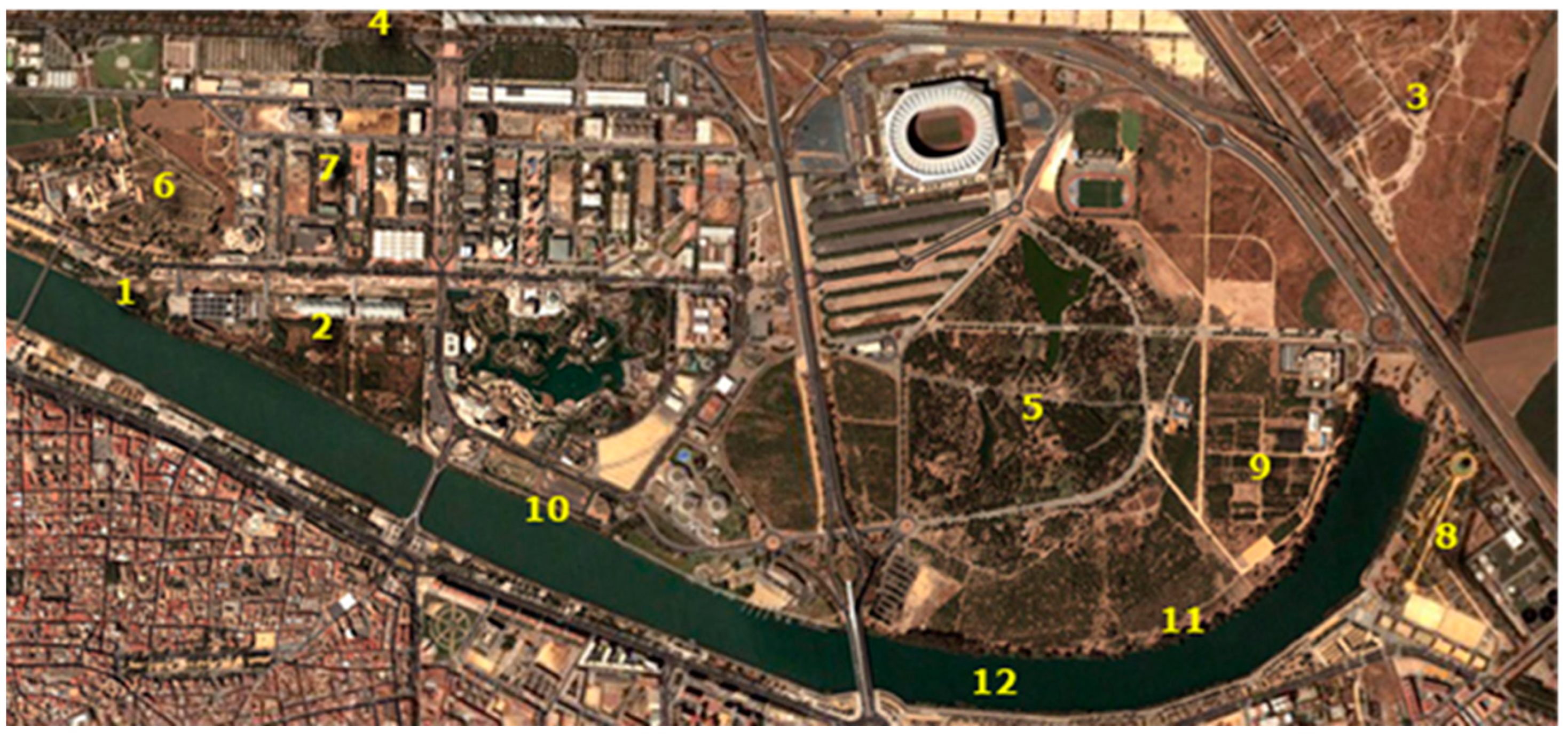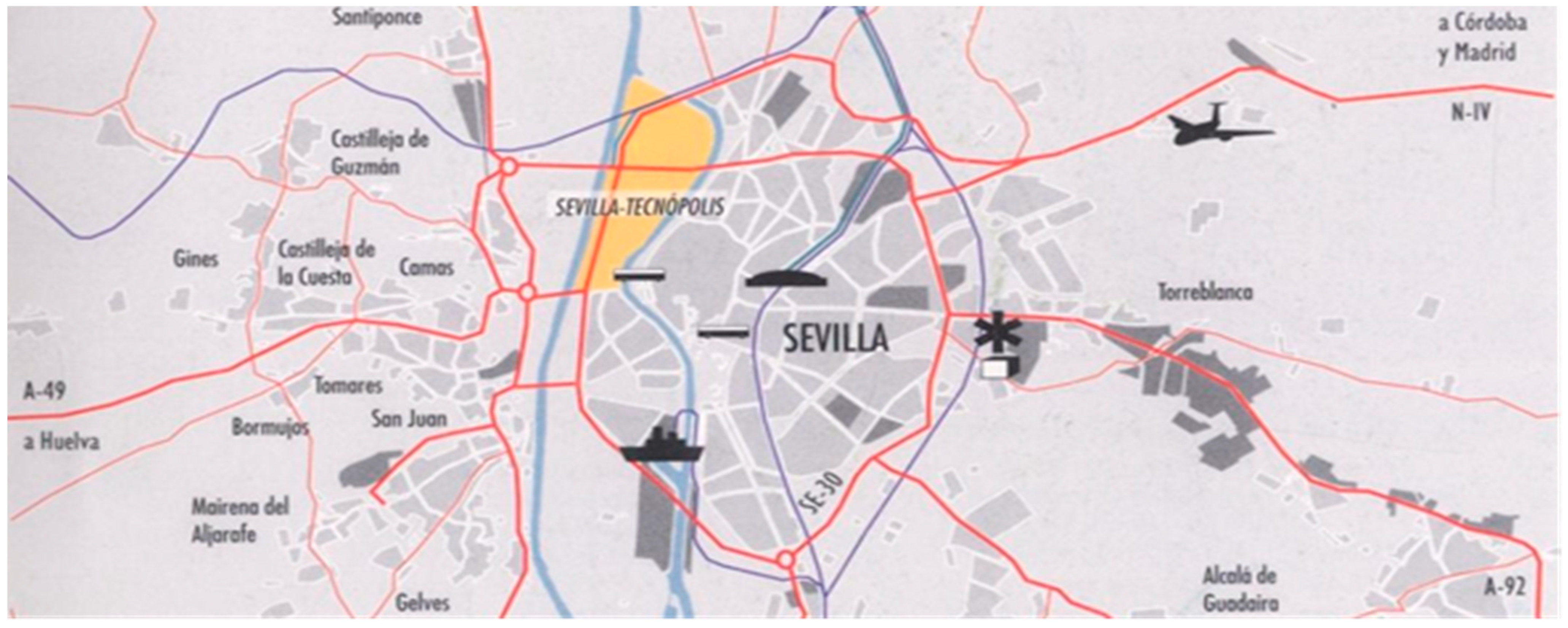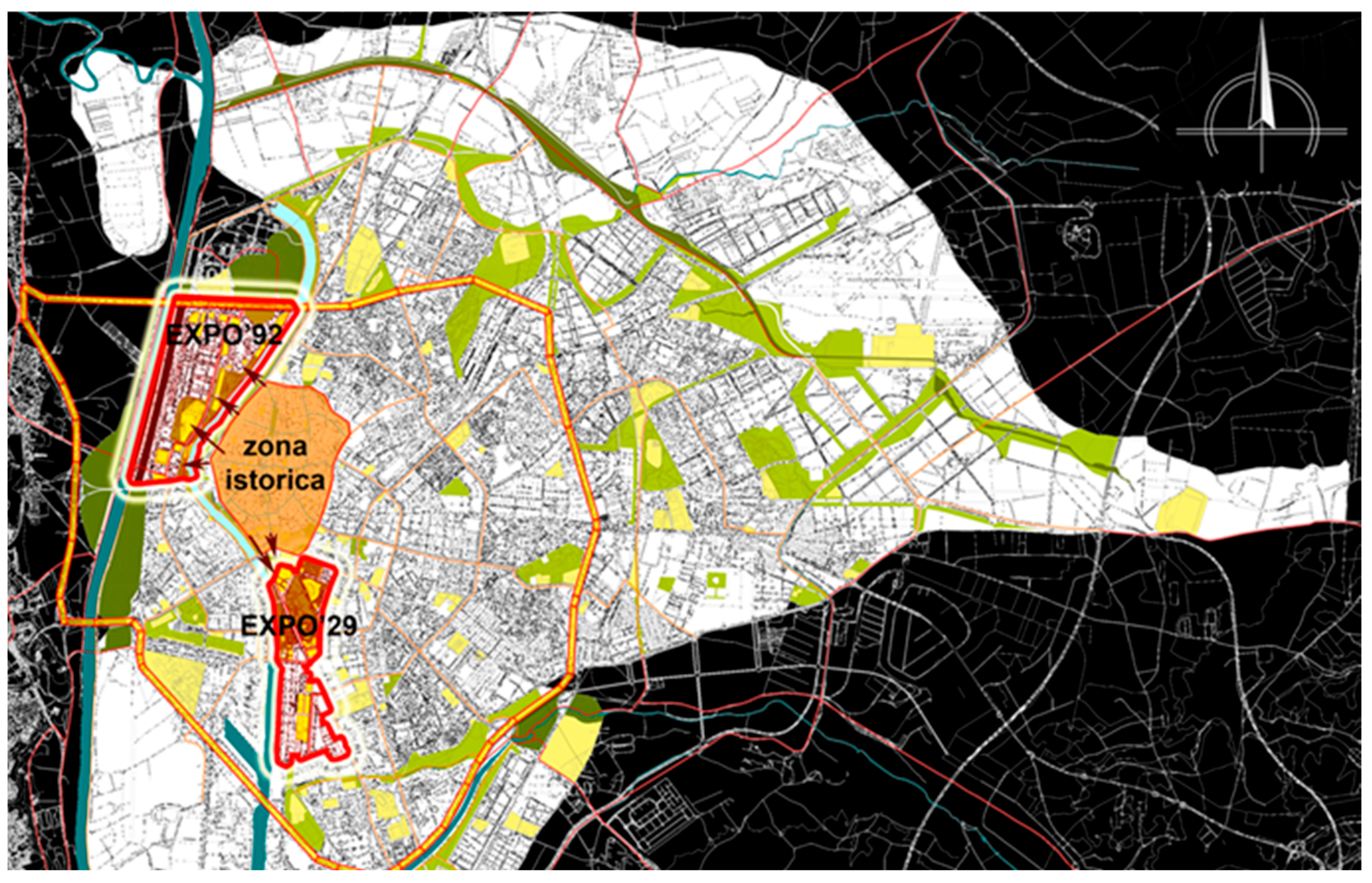 10]. The first one was the Ibero-American Exhibition (130 ha), located in the south of the historic area, which took place in 1929. The Great Ibero-American Exhibition allowed the sudden development of the city towards the South; the exhibition pavilions are currently part of the buildings that serve the city—they are either the headquarters of the embassies of the countries once represented or various centers belonging to the faculties—libraries, exhibition halls, etc. The second exhibition was EXPO’92 (250 ha), located in the North, North-West of the historic area, the Great Universal Exhibition of Seville—EXPO’92 took place in 1992, greatly impacting the city.