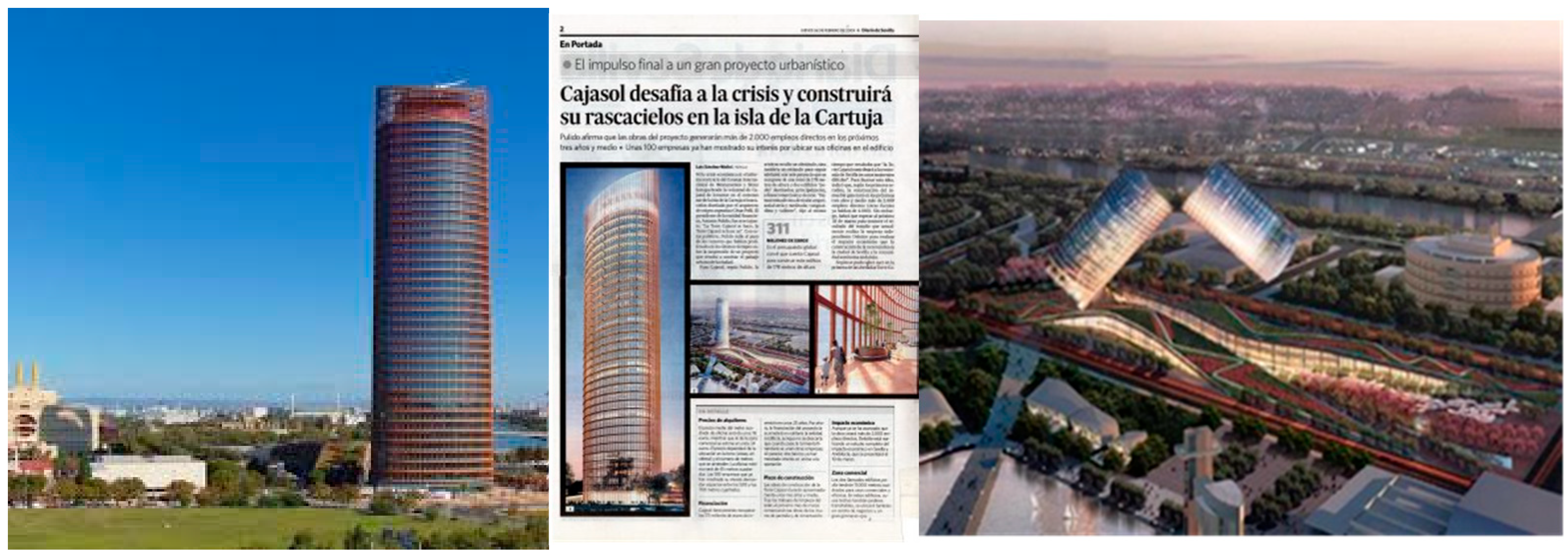 Step 3 involves new projects for the Cartuja Island, such as the new Pelli tower—an office building with commercial spaces, terraces, and green areas at the base (existing proposal).
