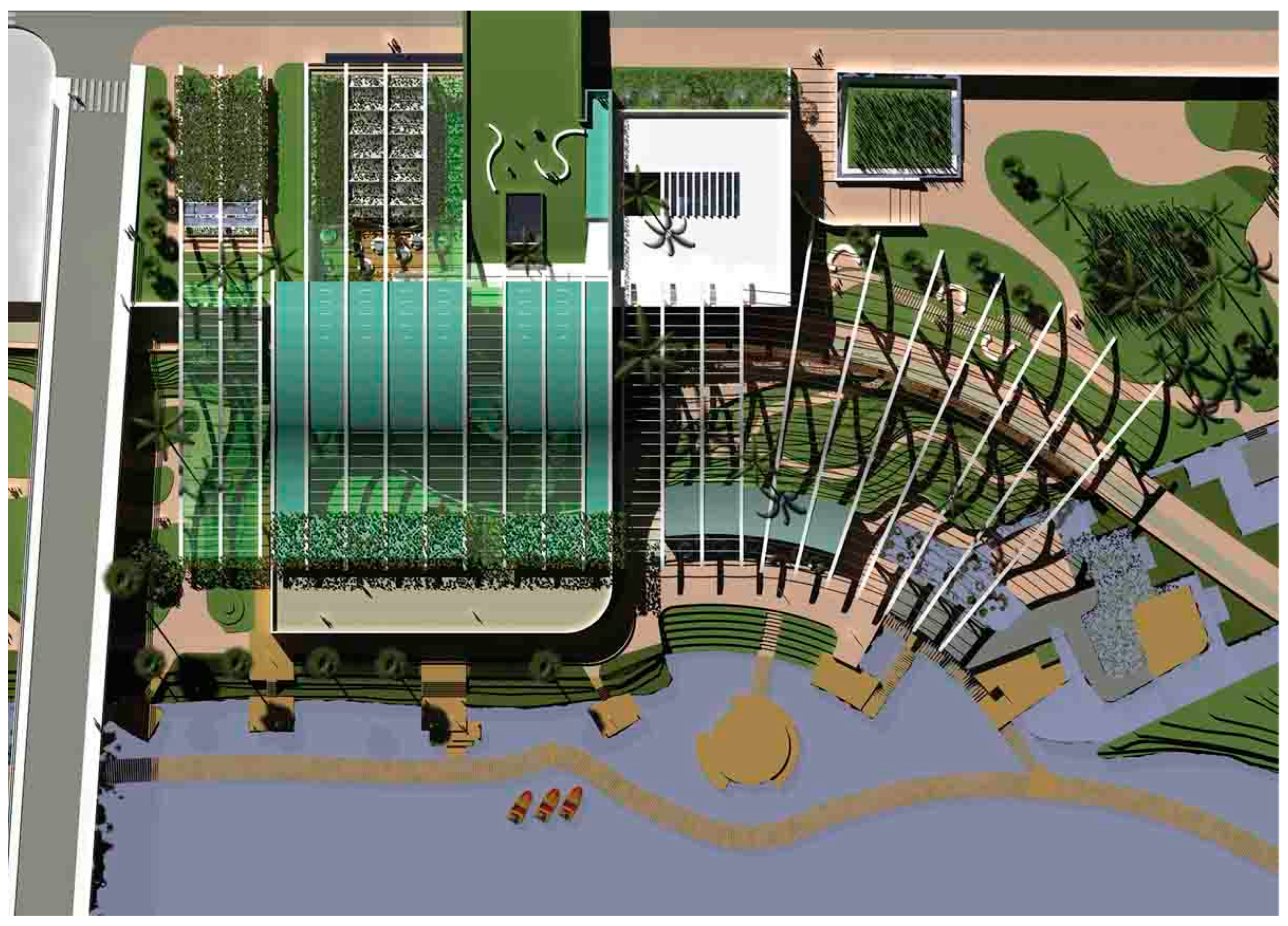 The project will detail a multifunctional center with botanical garden specificity. The chosen theme is directly related to what is currently found on the site—namely the remains of a former garden with plants brought from Latin America, a simulation of the Amazonian rainforest (the evergreen equatorial forest that covers the entire Amazon basin), which, unfortunately, if the necessary attention is not given to its rescue as soon as possible, will disappear. A former area of fountains and small water basins that once connected the artificial lake and the river now exists only as abandoned infrastructure once the exhibition ended, as we can see from