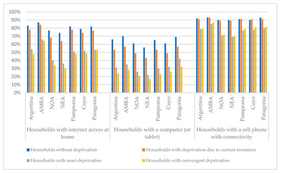 In line with the above, the greatest access to ICTs was observed in households with no deprivation (both nationally and regionally), followed by those with only current resource deprivation. In both types of households, there were similar levels of coverage of the technologies studied. In contrast, households with patrimonial and convergent deprivation had more limited access to digital technologies.