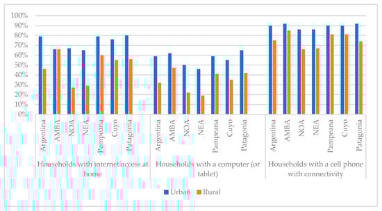 The greatest inequalities between urban and rural sectors, as well as the smallest percentages of access in both areas of residence, were found in the NOA and NEA regions. In contrast, the smallest gaps between territorial areas were found in AMBA, Pampeana, and Patagonia. In the urban areas of the national average and the aforementioned regions, the percentage of households that hade a cell phone with connectivity was around 90%; Internet access in the home reached approximately 80%; and computer (or tablet) ownership was between 60% and 65%.