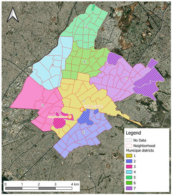 The study region is the municipality of Athens, which is the capital of Greece. According to the 2021 Population Census by the Hellenic Statistical Authority (Athens, Greece), there were 637,798 inhabitants, while there was a population decrease in the period 2011–2021. The municipality of Athens is divided into seven municipal districts, which are used for administrative purposes. In addition, some more detailed divisions of the city of Athens are available, which are more appropriate for purposes of statistical analysis. In this study, the division of Athens into 144 neighborhoods is used. However, nine of the designated neighborhoods concern public spaces (parks, archeological sites, and public buildings), and there are no houses in them. Therefore, these neighborhoods do not have any short-term rentals and are not used in the analysis. In Figure 1, the municipal districts, as well as the neighborhoods of Athens, are presented.